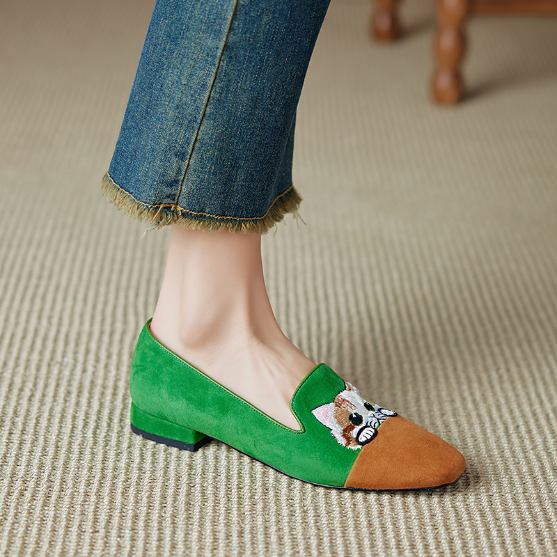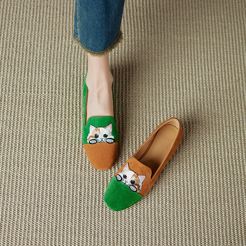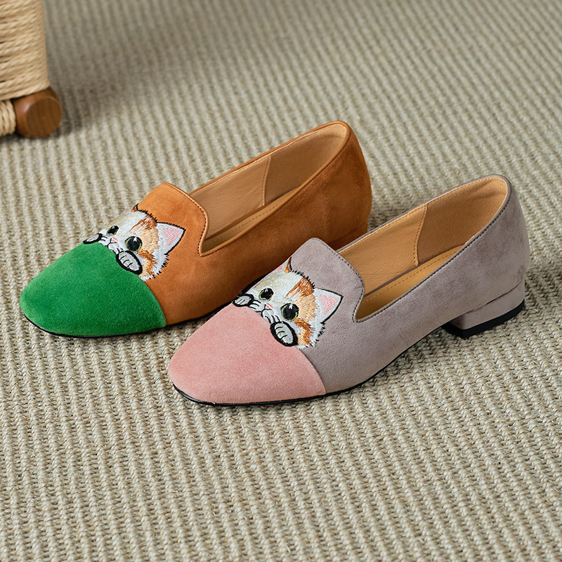 女单鞋 可爱猫咪刺绣软底国风低跟豆豆鞋 羊反绒春秋季 2025年新款