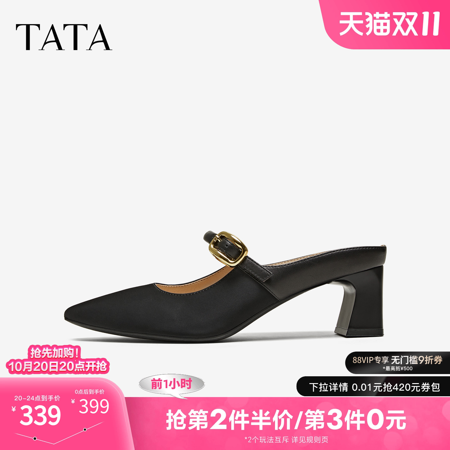 气质尖头高跟真皮拖鞋 女鞋 2025夏XGM02BH5 粗跟穆勒鞋 TATA他她法式