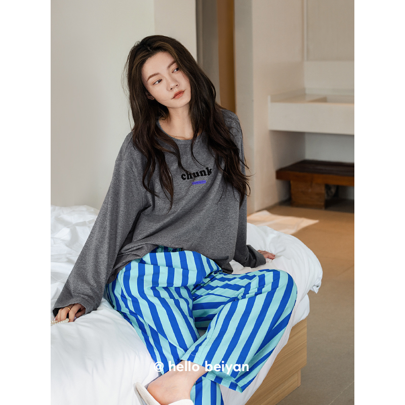 新款 宽松大码 长袖 套装 休闲家居服 条纹长裤 贝妍柔软棉睡衣女春秋季
