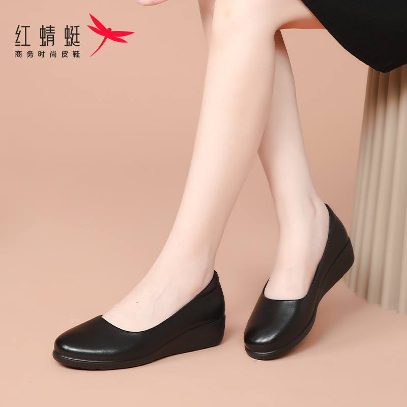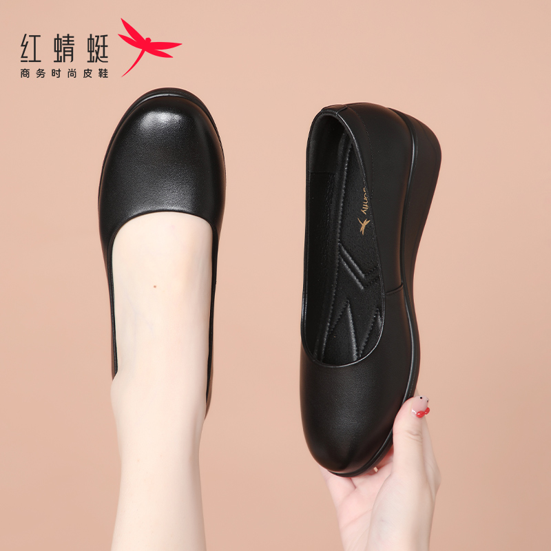 黑小皮鞋 女真皮妈妈牛皮单鞋 春秋平底坡跟职业软底皮鞋 红蜻蜓女鞋