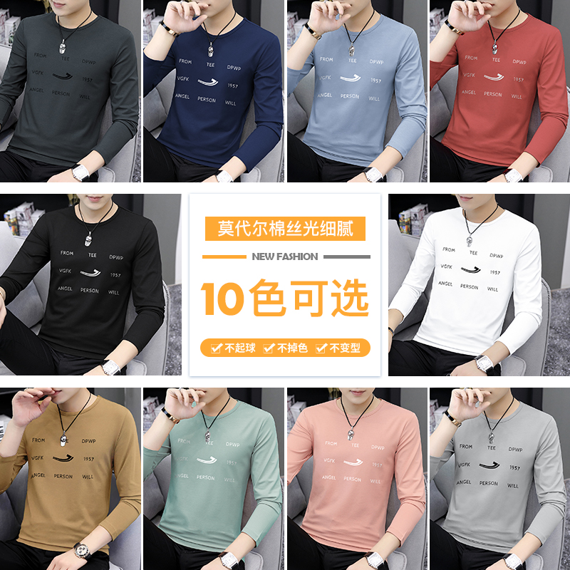 内搭圆领打底衫 莫代尔长袖 潮流字母印花黑色小衫 修身 秋衣 t恤男装