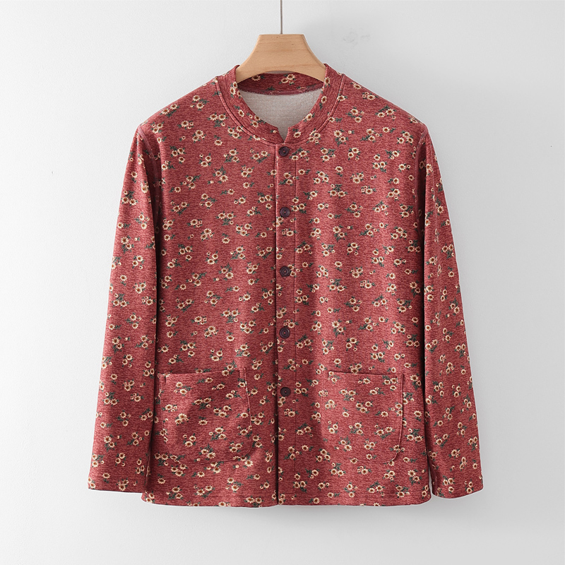 衫 中老年女士双面磨绒开衫 系扣保暖上衣妈妈碎花上衣德绒开口长袖
