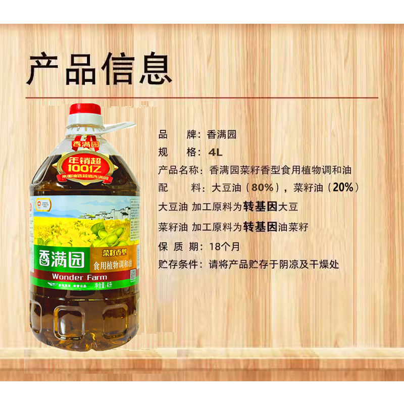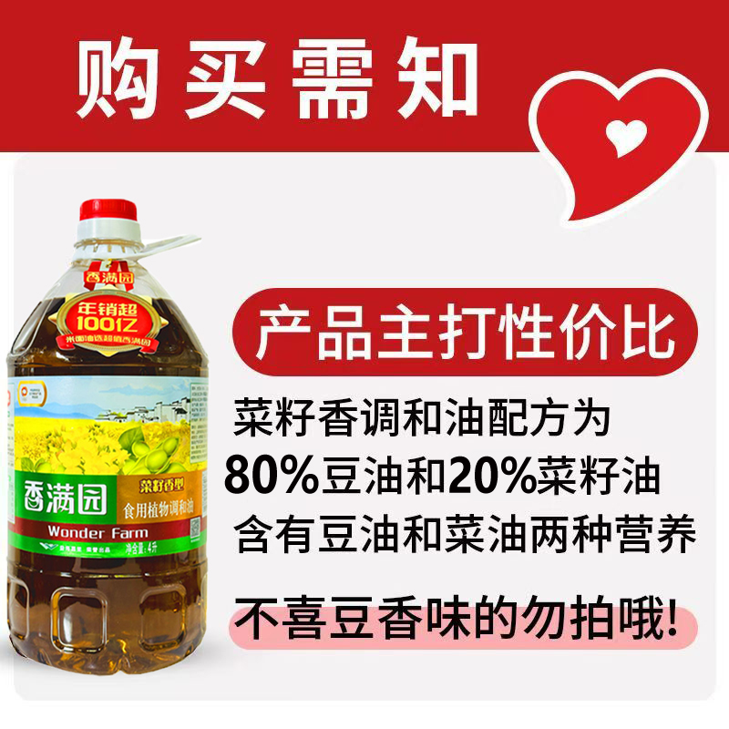 香满园菜籽香型食用植物调和油4L家用商用炒菜食用油实惠装 大豆