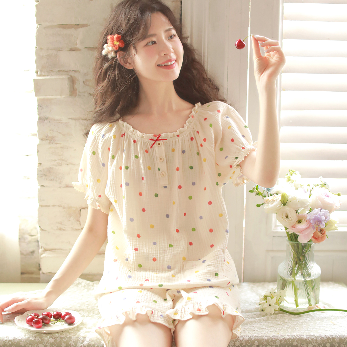 甜美波点家居服套装 富朵夏季 短裤 长裤 三件套睡衣双层柔软棉纱短袖
