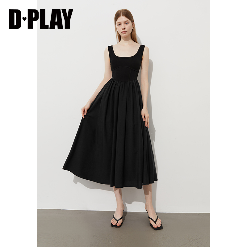 惠品 时尚 2025年夏季 黑色圆领连衣裙女修身 大摆长裙 新款 DPLAY