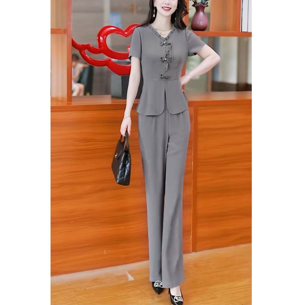 上衣微喇叭长裤 2025夏新款 女国风盘扣短袖 遮肉显瘦套装 两件套 时尚
