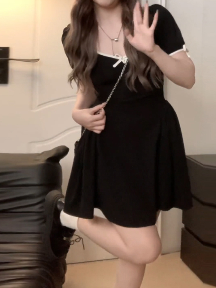 2025年气质收腰方领包臀裙法式 黑色连衣裙女 性感皱褶高开叉中长款