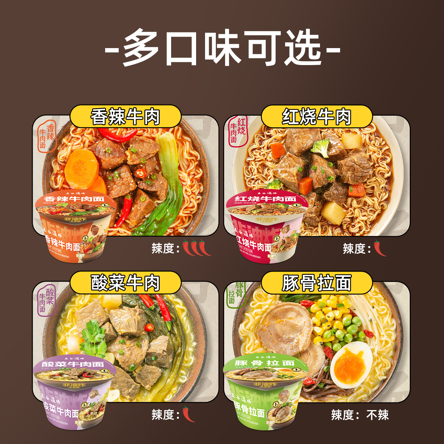 五谷道场方便面非油炸香辣牛肉桶装 整箱批发懒人速食面食夜宵泡面
