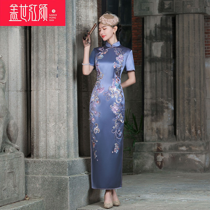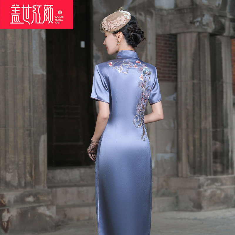 礼服宴会连衣裙10月份 妈妈长袖 紫色旗袍喜婆婆婚装 中年女2025新款