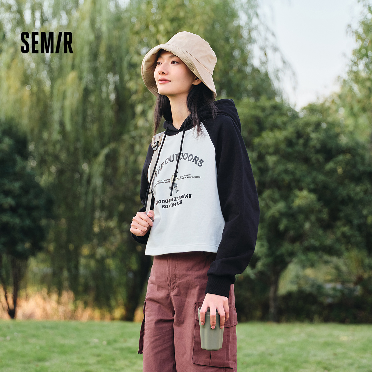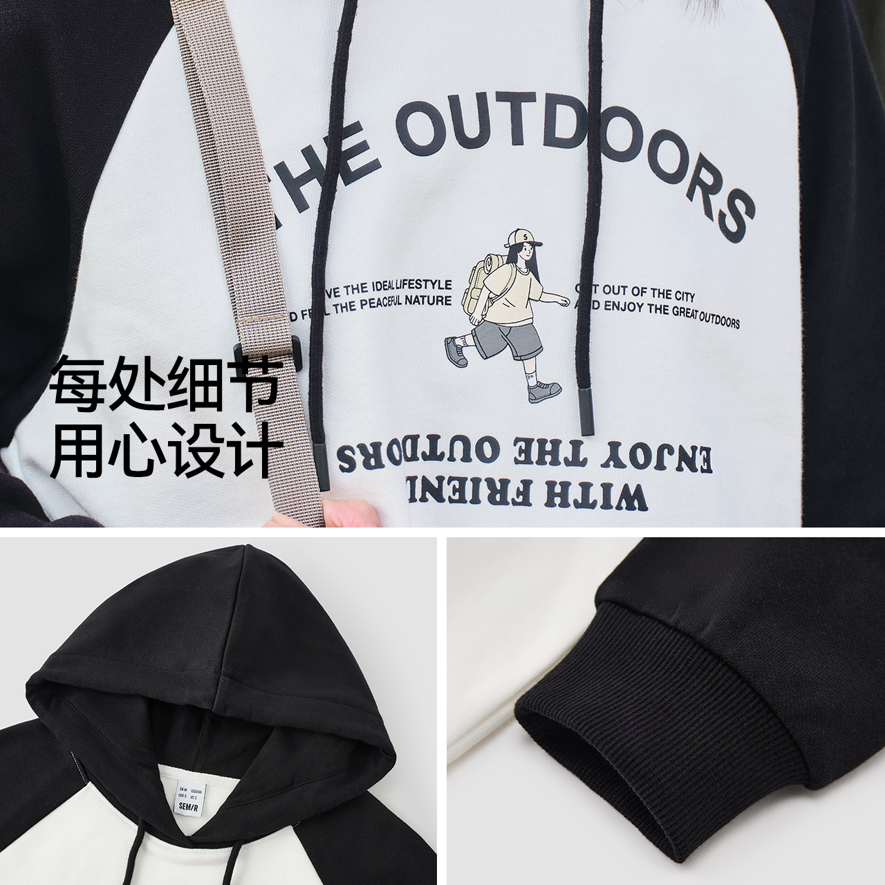 拼色宽松2024春新款 印花插肩袖 森马卫衣女短款 连帽上衣 商场同款