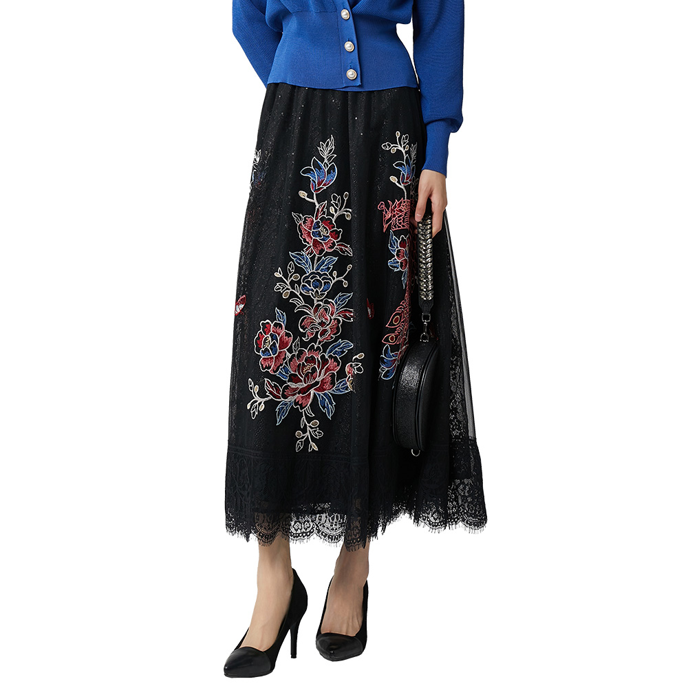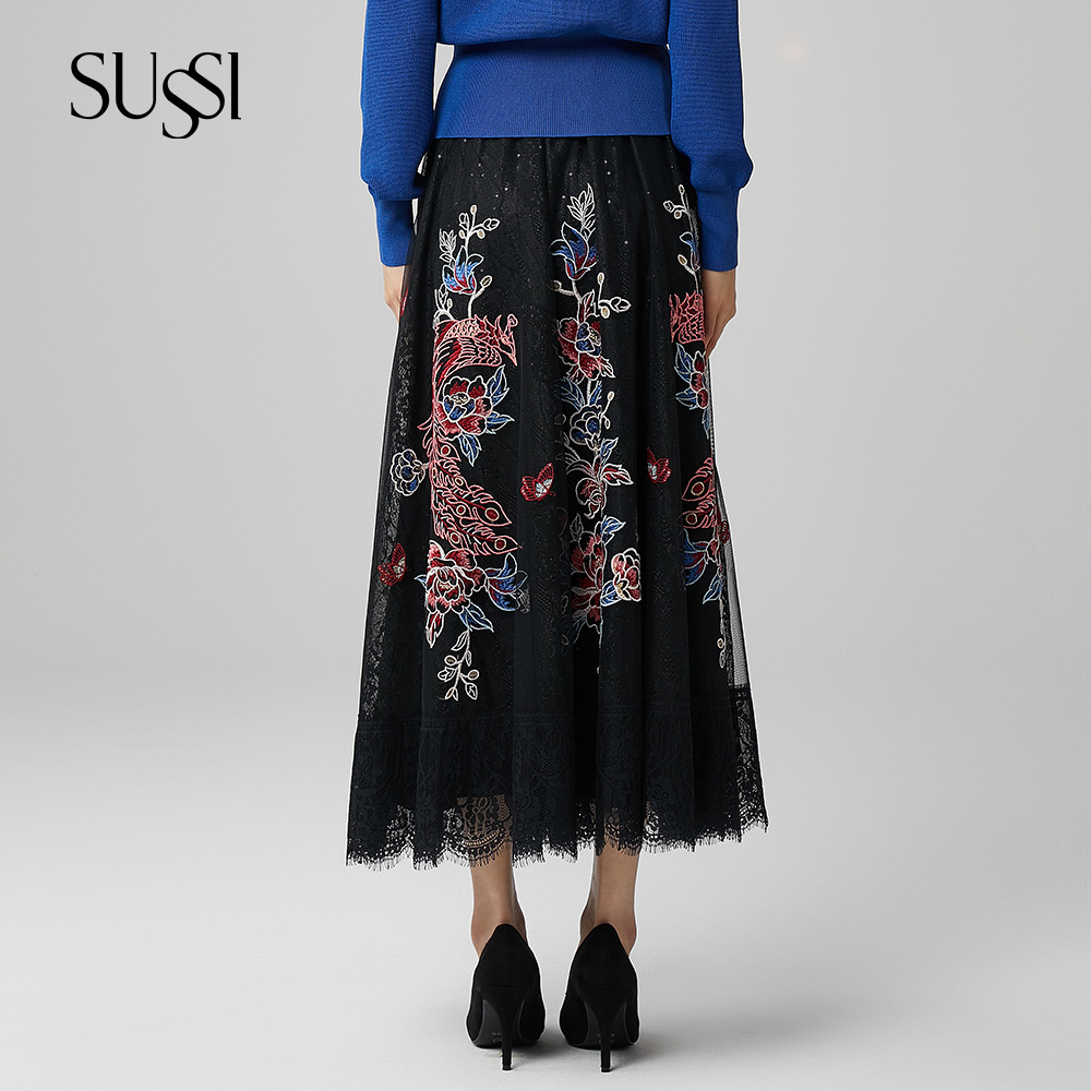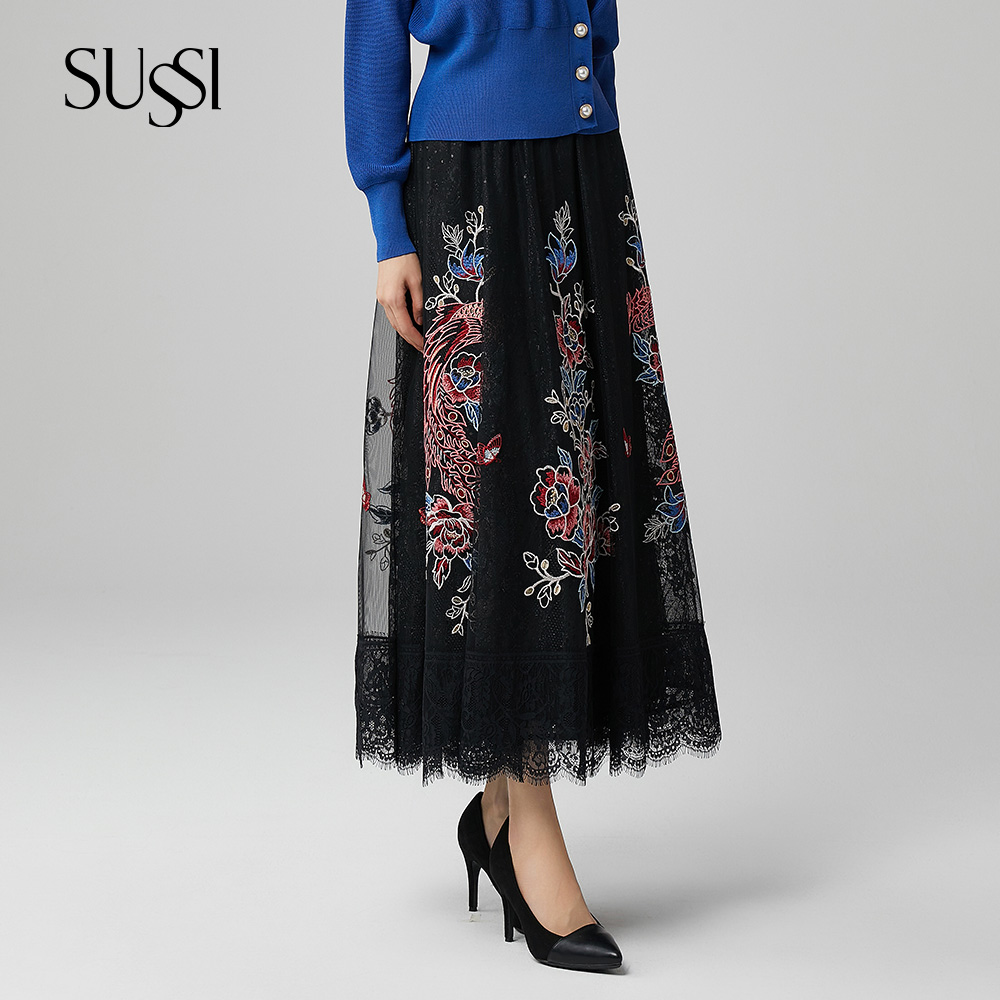 SUSSI 黑色网纱刺绣透蕾丝半身裙伞裙女 古色24春夏商场同款