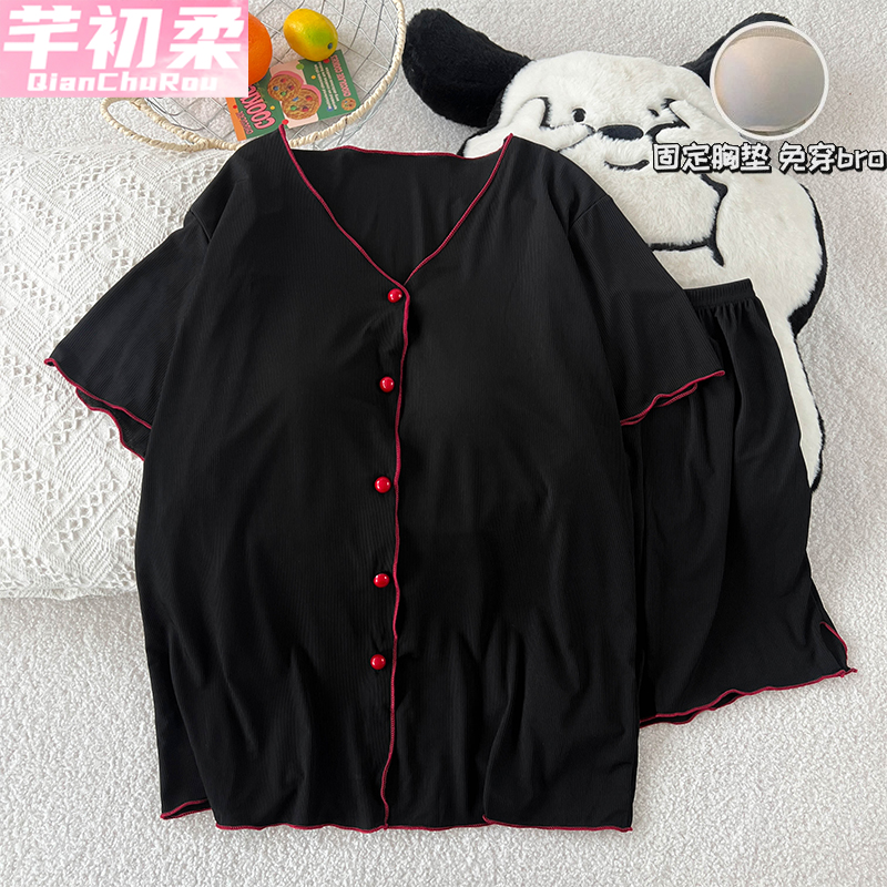 纯欲甜美套装 睡衣女夏季 开衫 短裤 莫代尔凉感家居服 带胸垫一体短袖