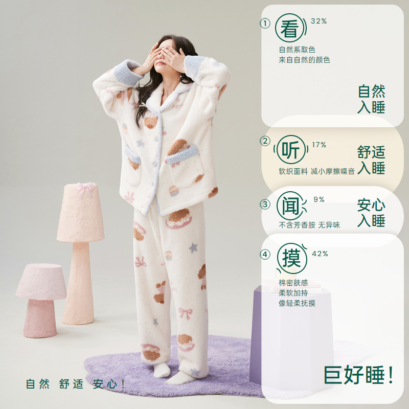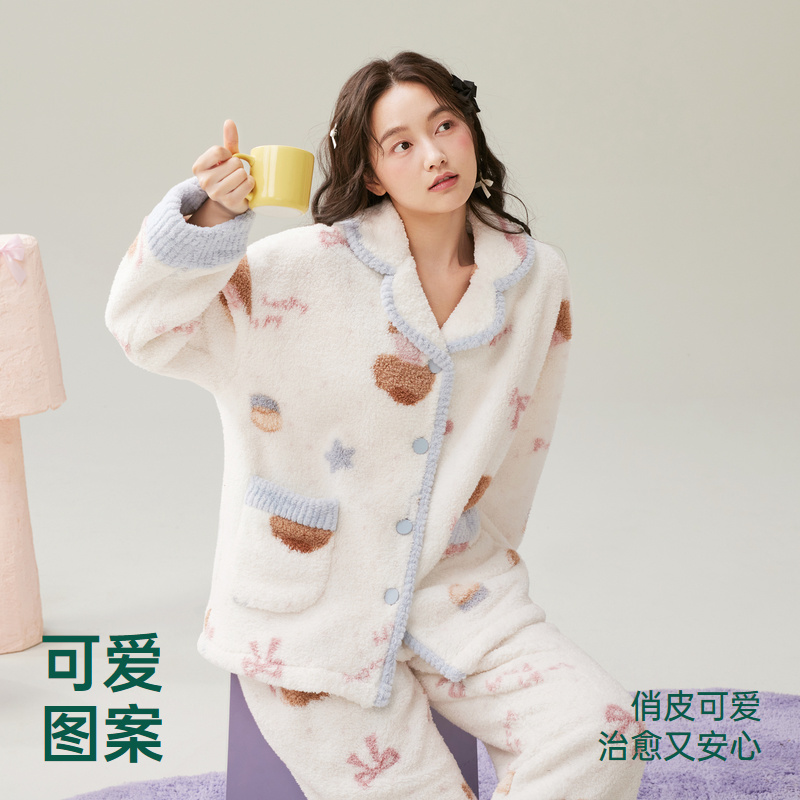 翻领加厚法兰绒家居服套装 安之伴 秋冬季 珊瑚绒睡衣女款 巨保暖