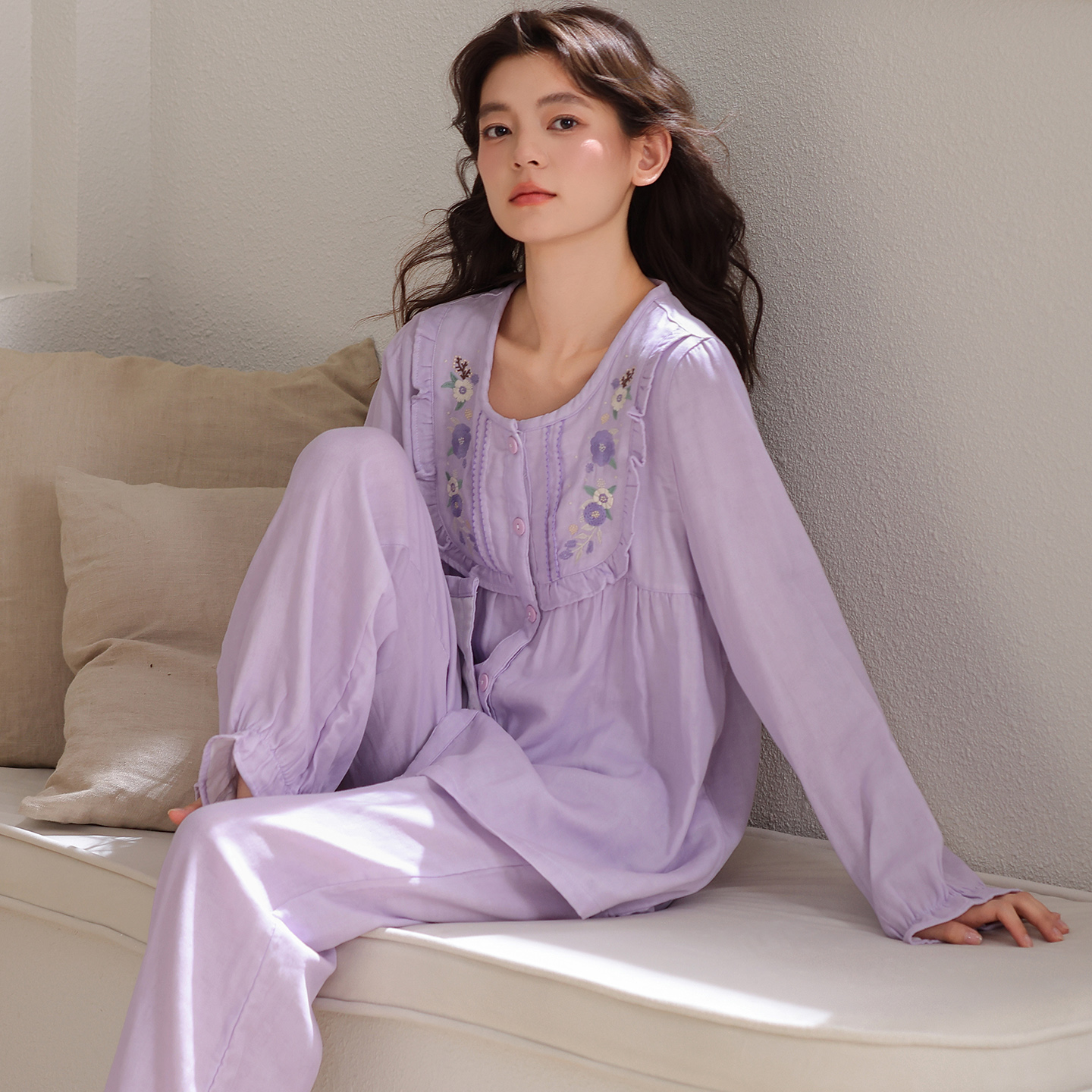 休闲甜美刺绣家居服套装 2025新款 睡衣女云朵棉双层纱布长袖 春秋季