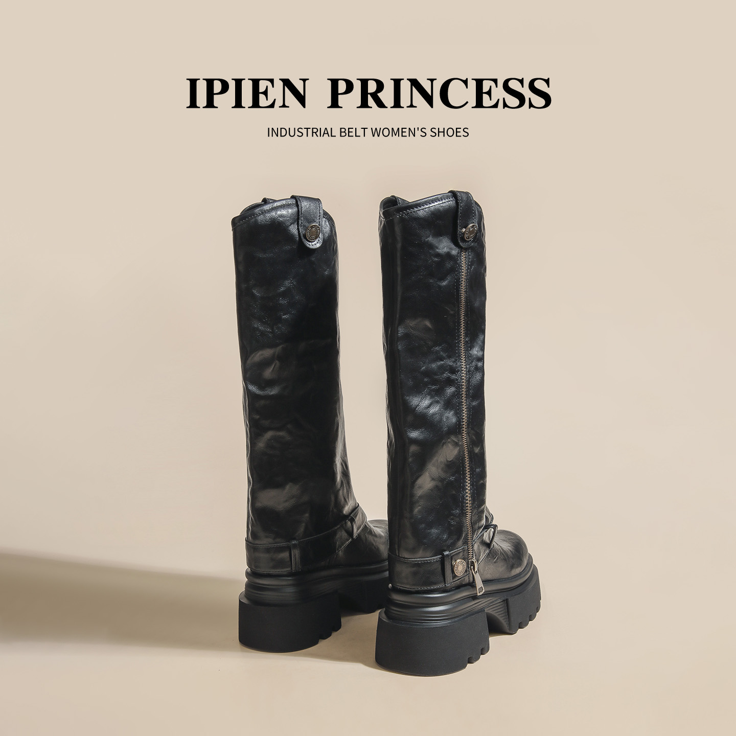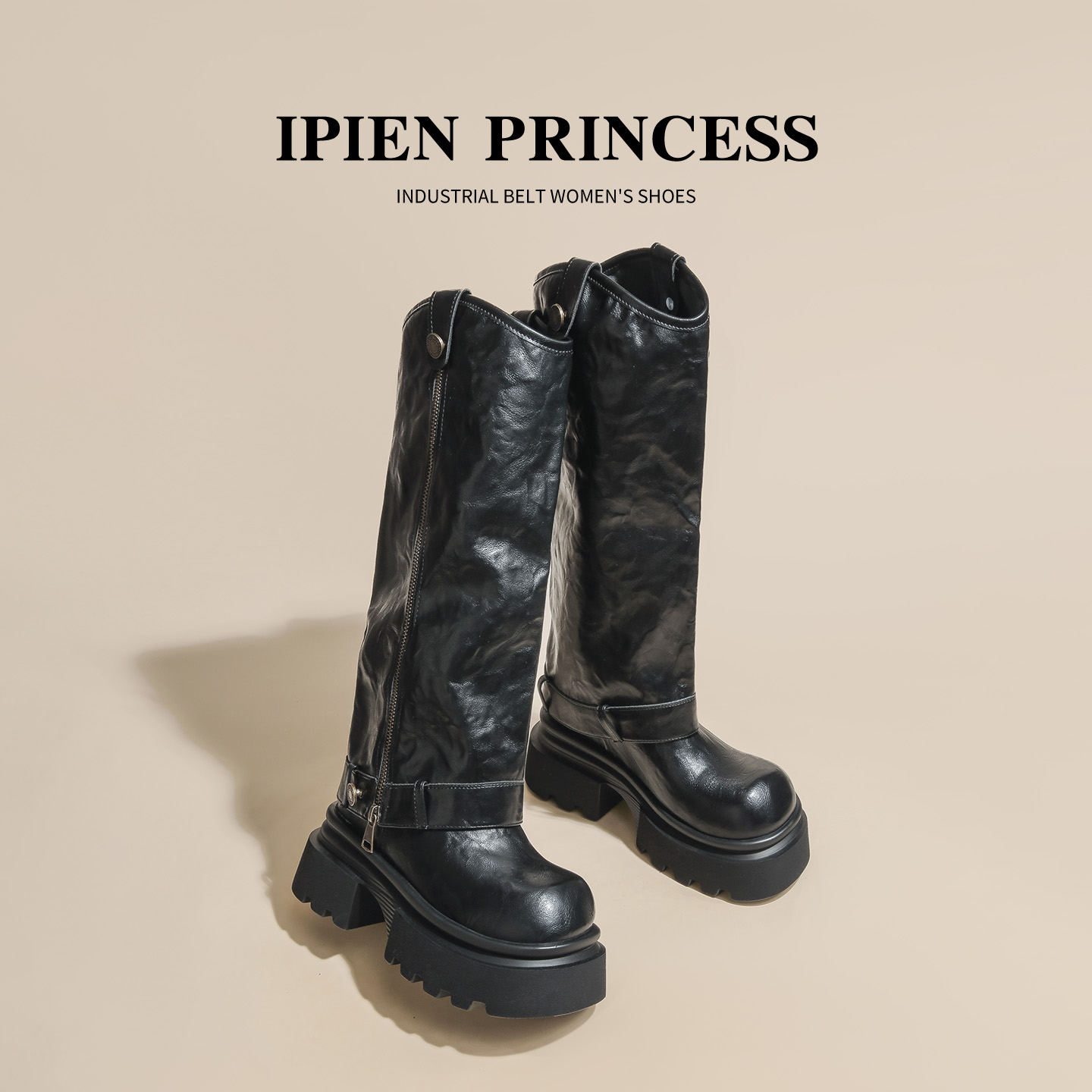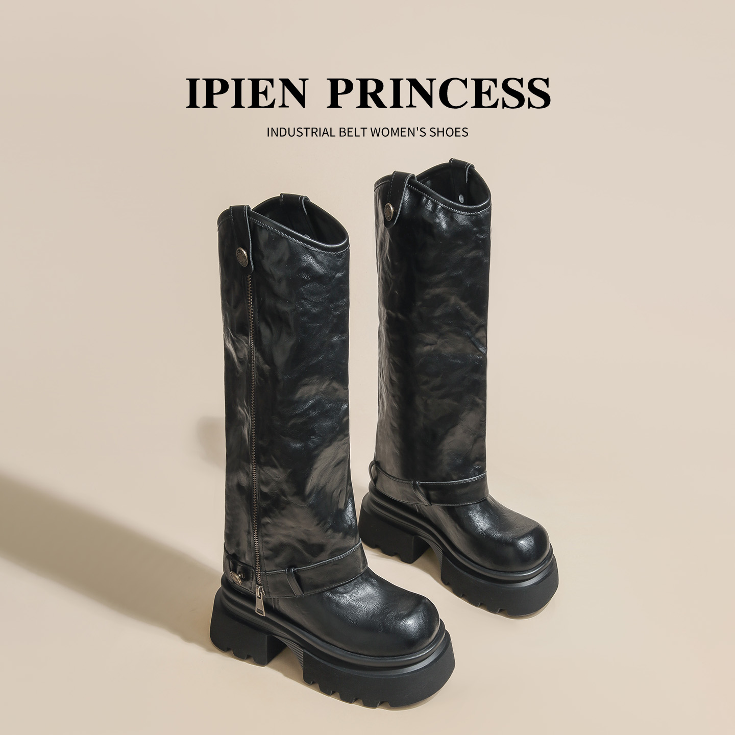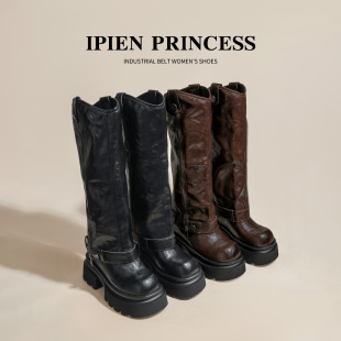 黑色长筒靴女2025春秋新款 管马丁靴 厚底皮带扣机车靴超高跟两穿裤