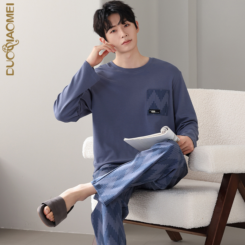 睡衣春秋季 可外穿家居服秋冬套装 华夫格纯棉长袖 大码 四季 轩靓男士