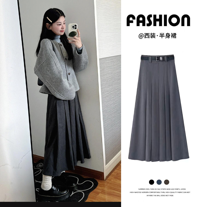 图曼朵灰色毛呢百褶半身裙女高腰加厚a字裙秋冬通勤面试中长半裙