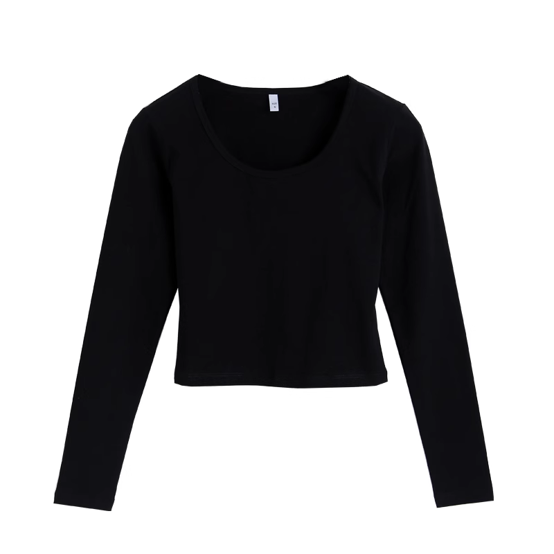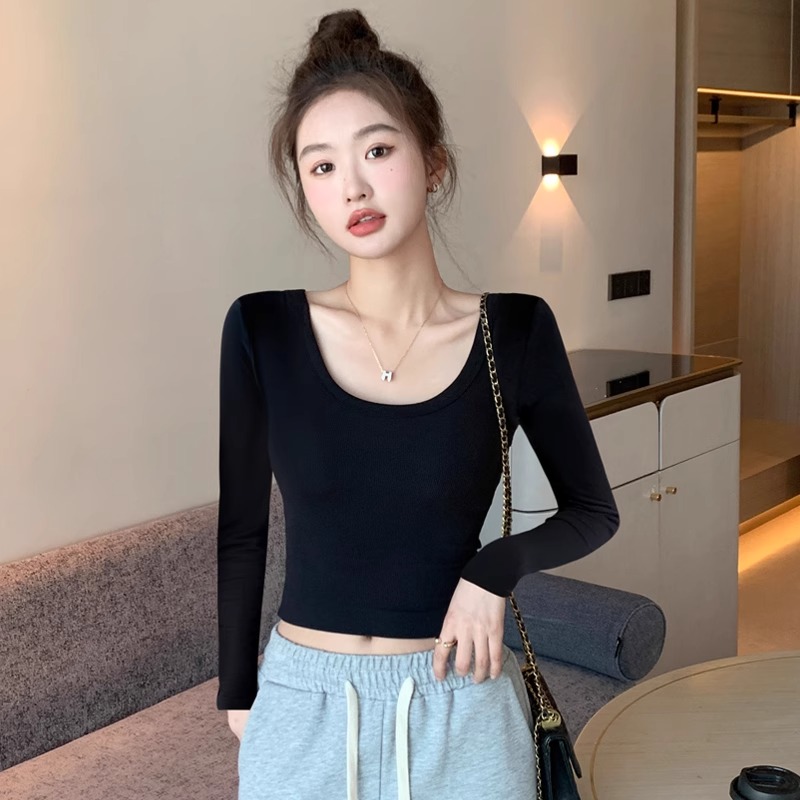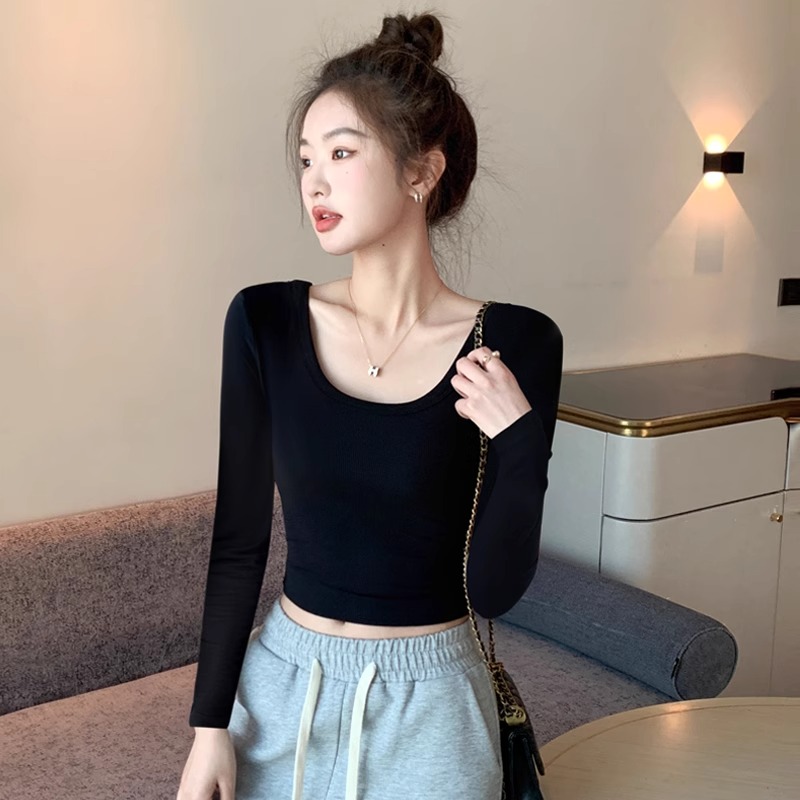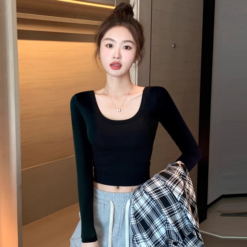 露脐长袖 紧身显瘦低领短款 上衣 女内搭秋冬新款 黑色正肩圆领打底衫