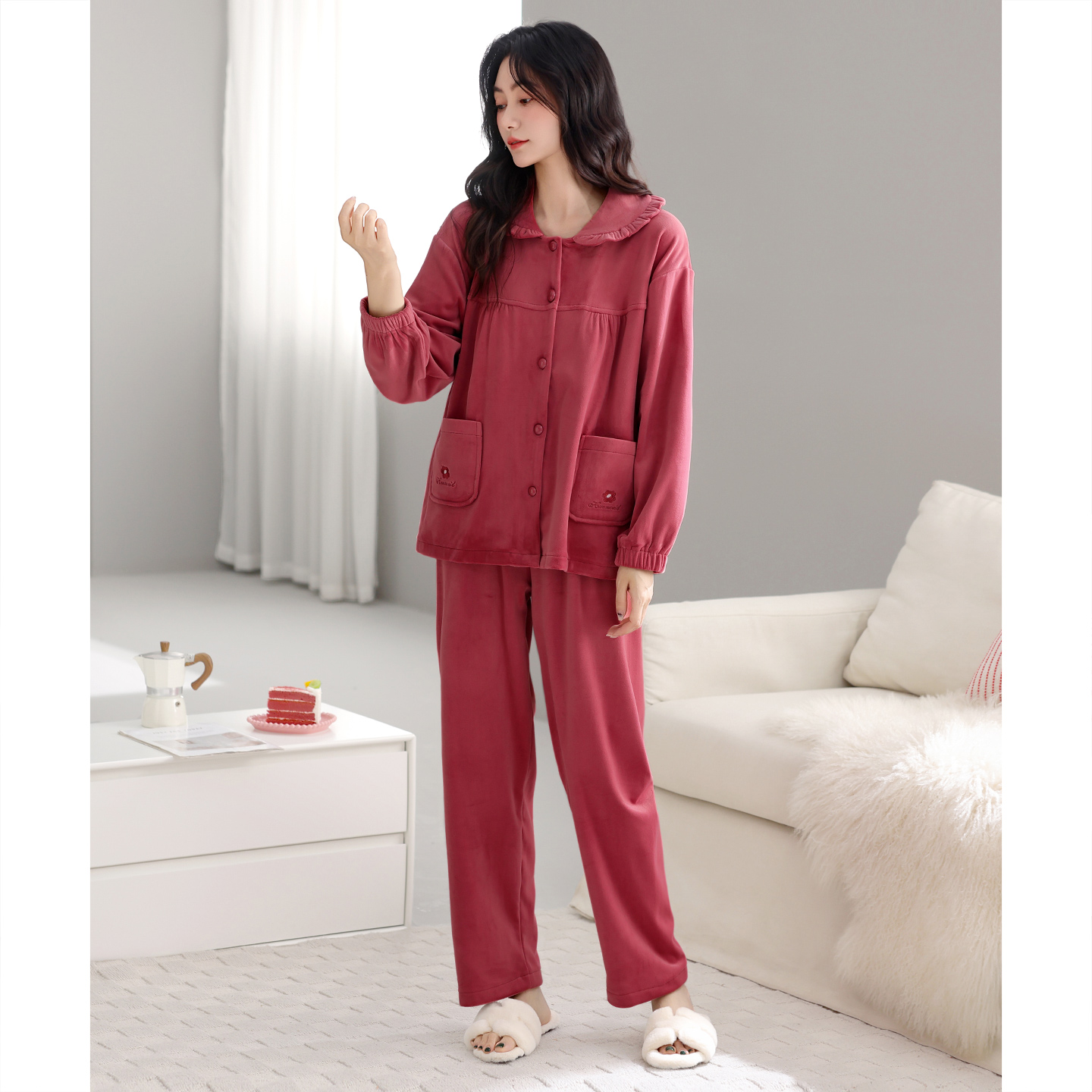 加厚珊瑚绒女士睡衣套装 秋冬加绒保暖法兰绒家居服两件套 简约长袖