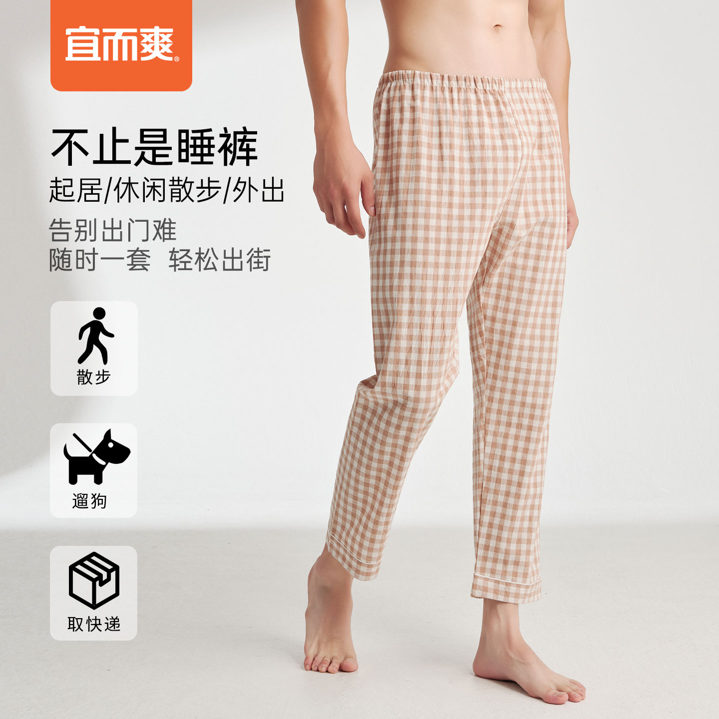 格子宽松直筒裤 宜而爽男士 可外穿睡裤 100%纯棉休闲裤 全棉家居长裤