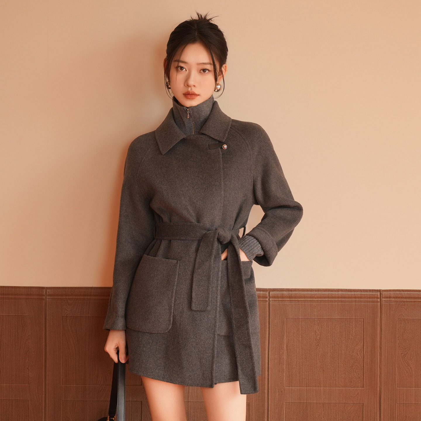 图曼朵灰色双面呢羊毛大衣女秋冬新款 毛呢短外套 高级感小个子短款
