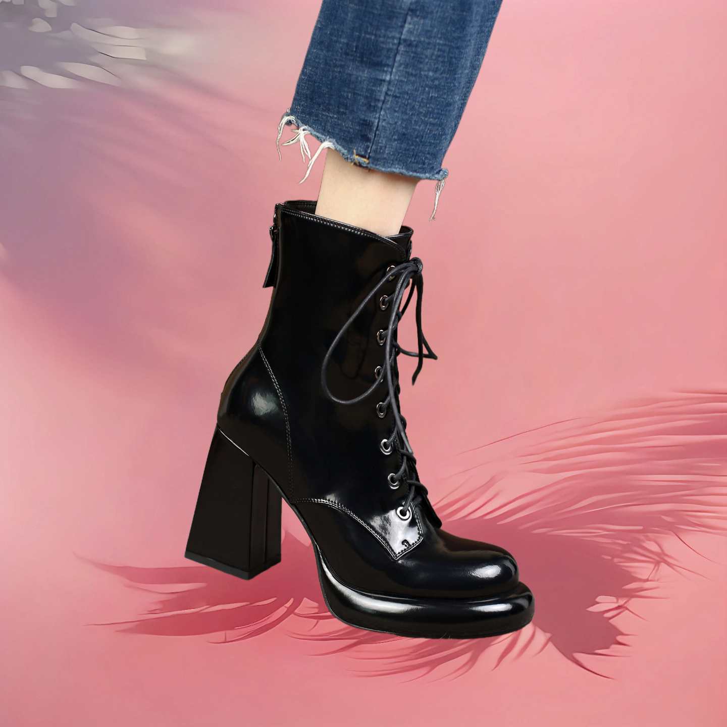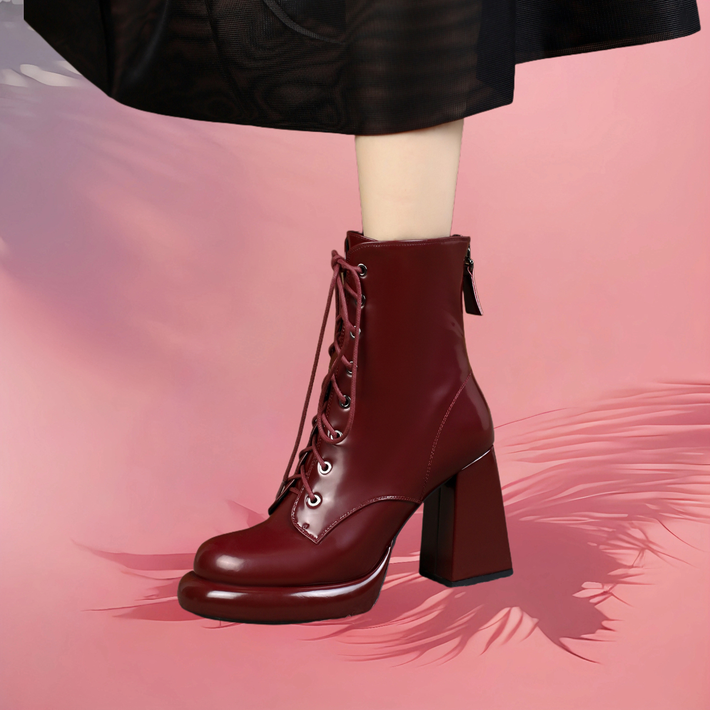 红色漆皮厚底马丁靴女2025新款 圆头防水台系带真皮高跟短靴子粗跟