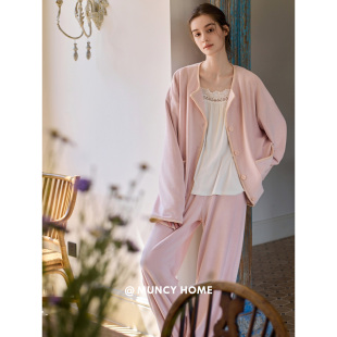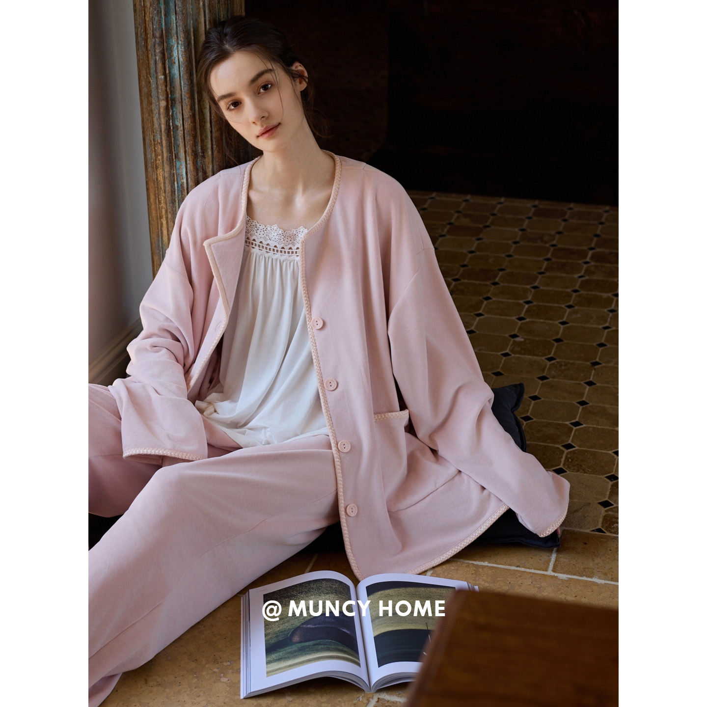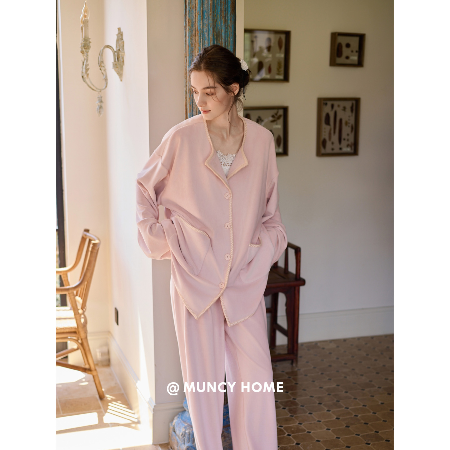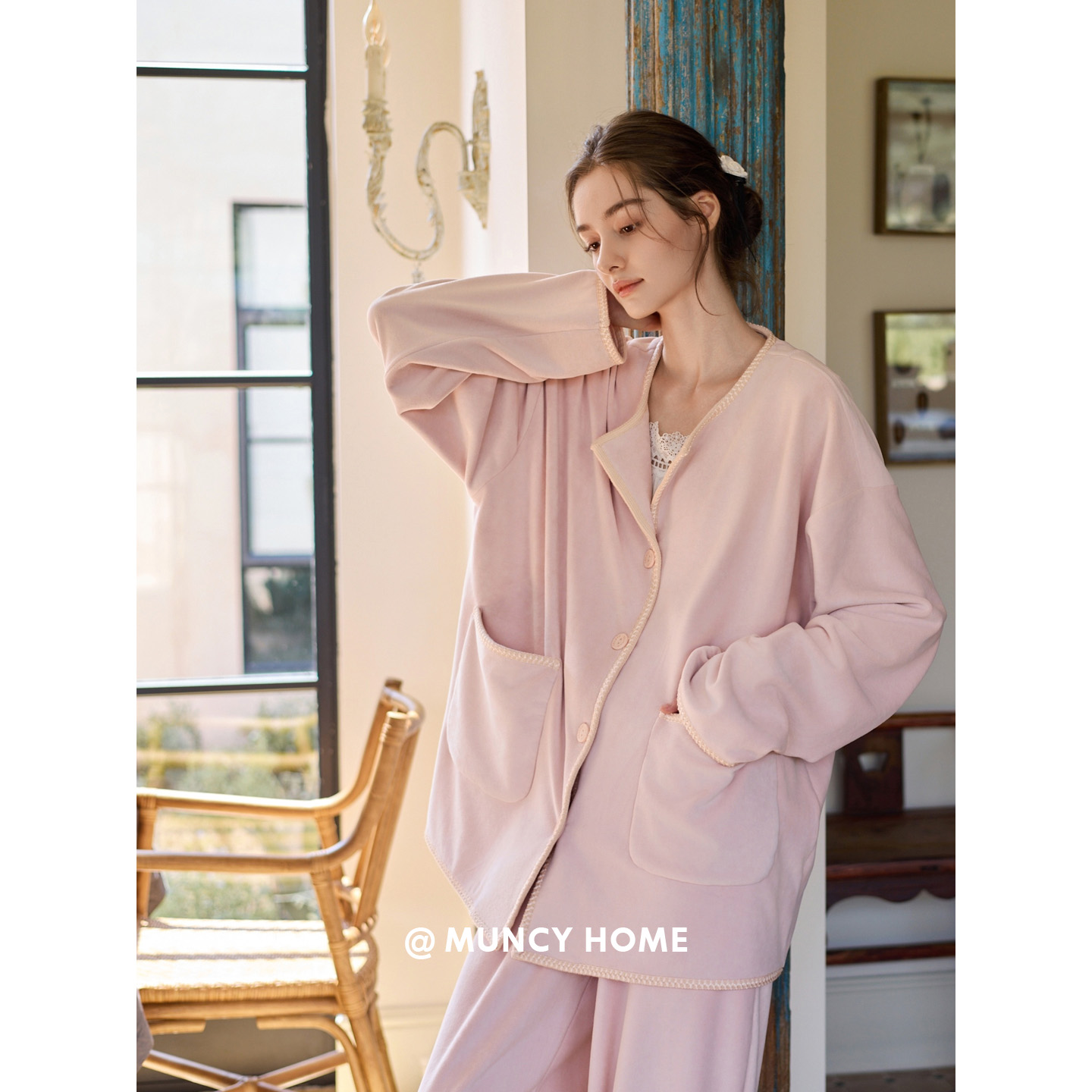 简约纯色薄绒家居服 海岛绒睡衣女秋冬保暖开衫 曼系 粉糯棉花糖