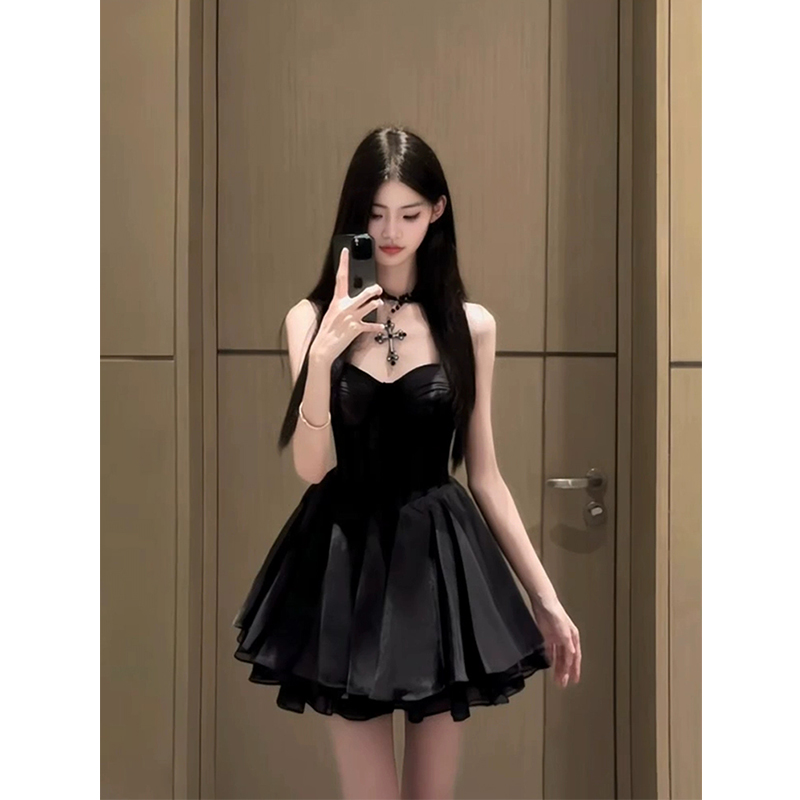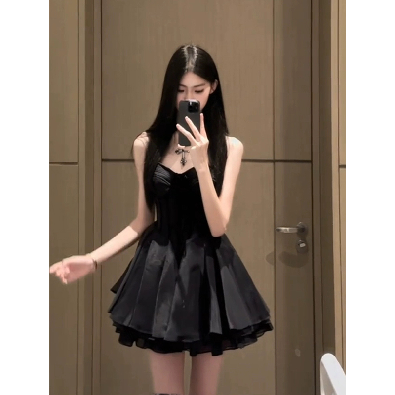 XZY 微胖甜辣千金风黑色鱼骨吊带裙女气质高级感收腰蓬蓬礼服短裙
