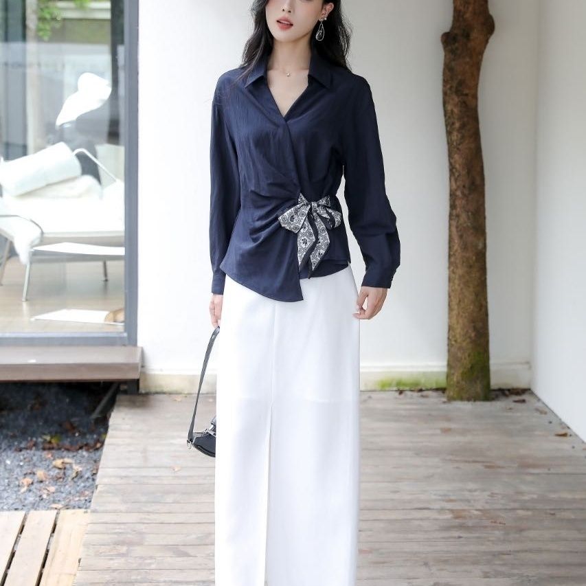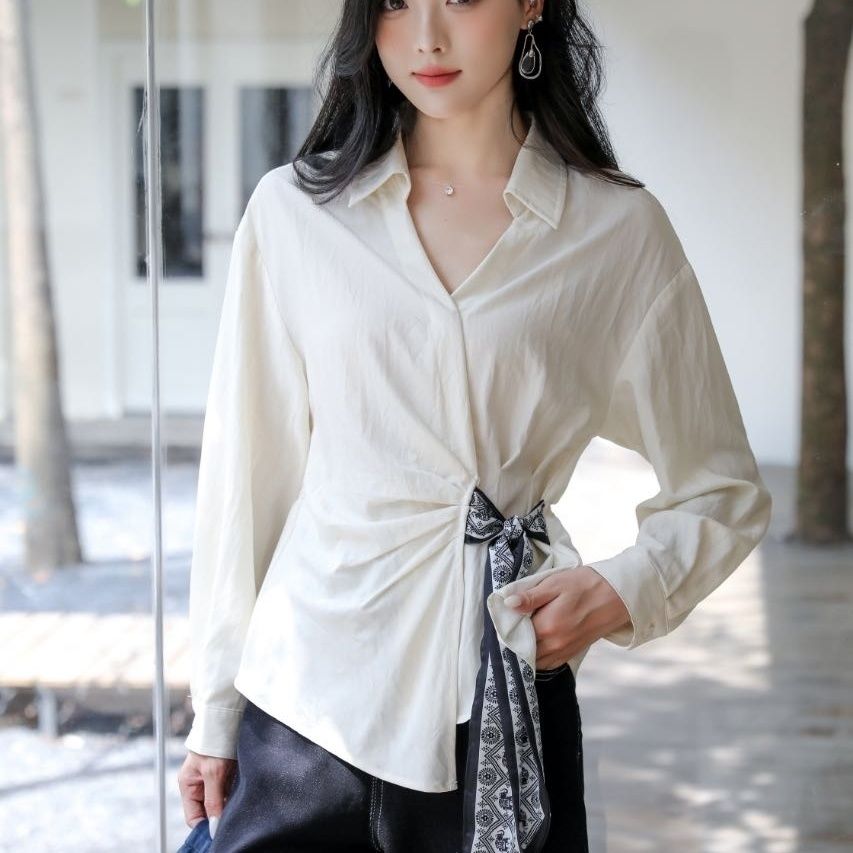 气质显瘦绑带不规则设计感 早秋新款 纯色韩系衬衣丝带V领衬衫 长袖