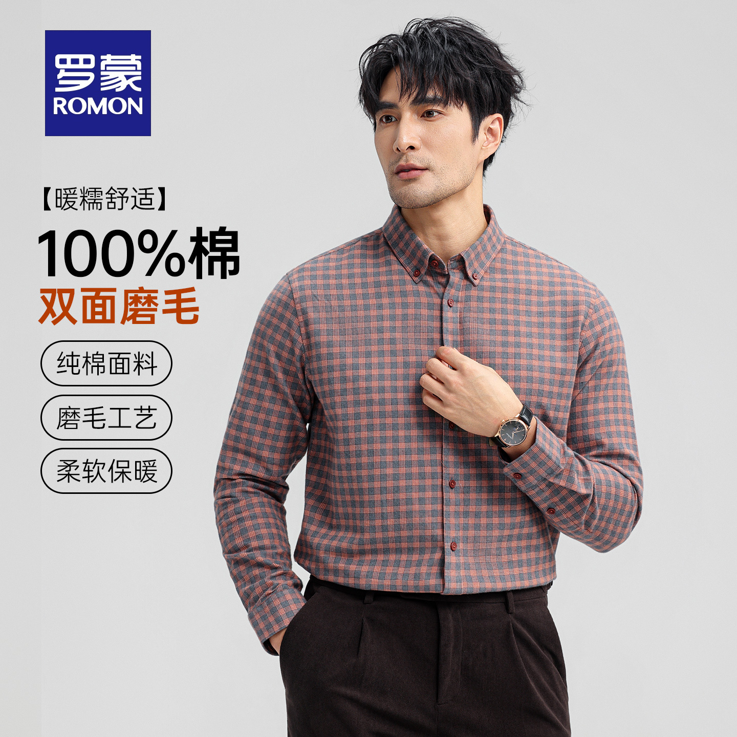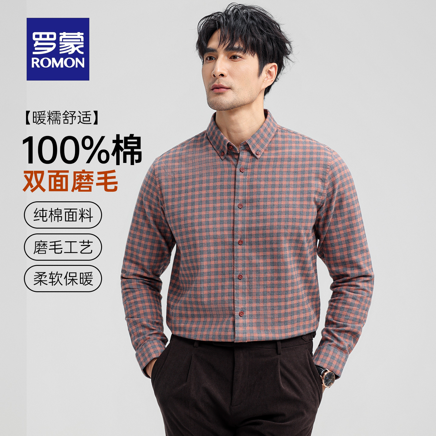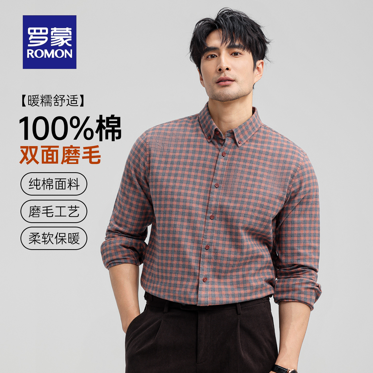 长袖 格子衬衫 2025秋季 商务职业工装 罗蒙男士 新款 磨毛衬衣 纯棉