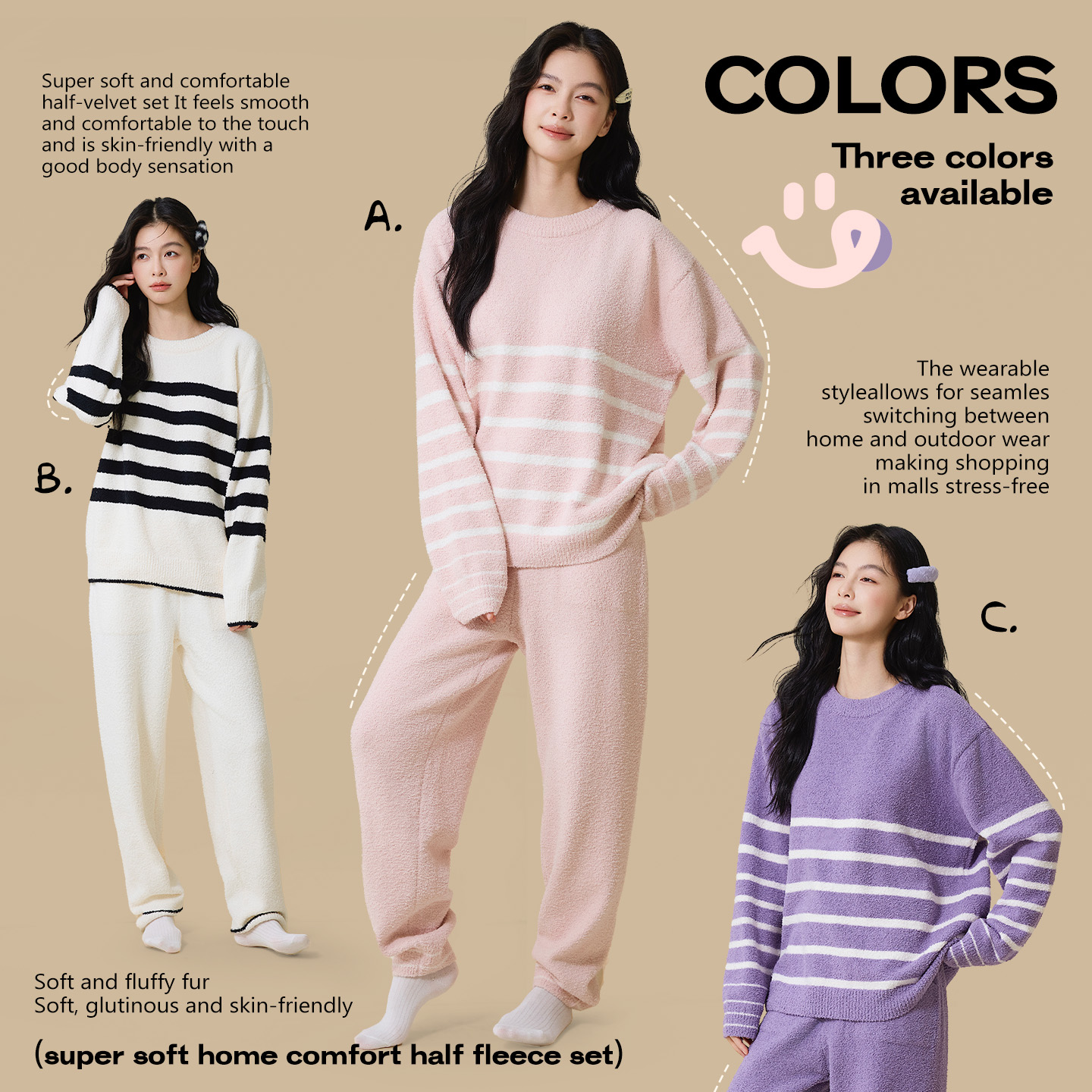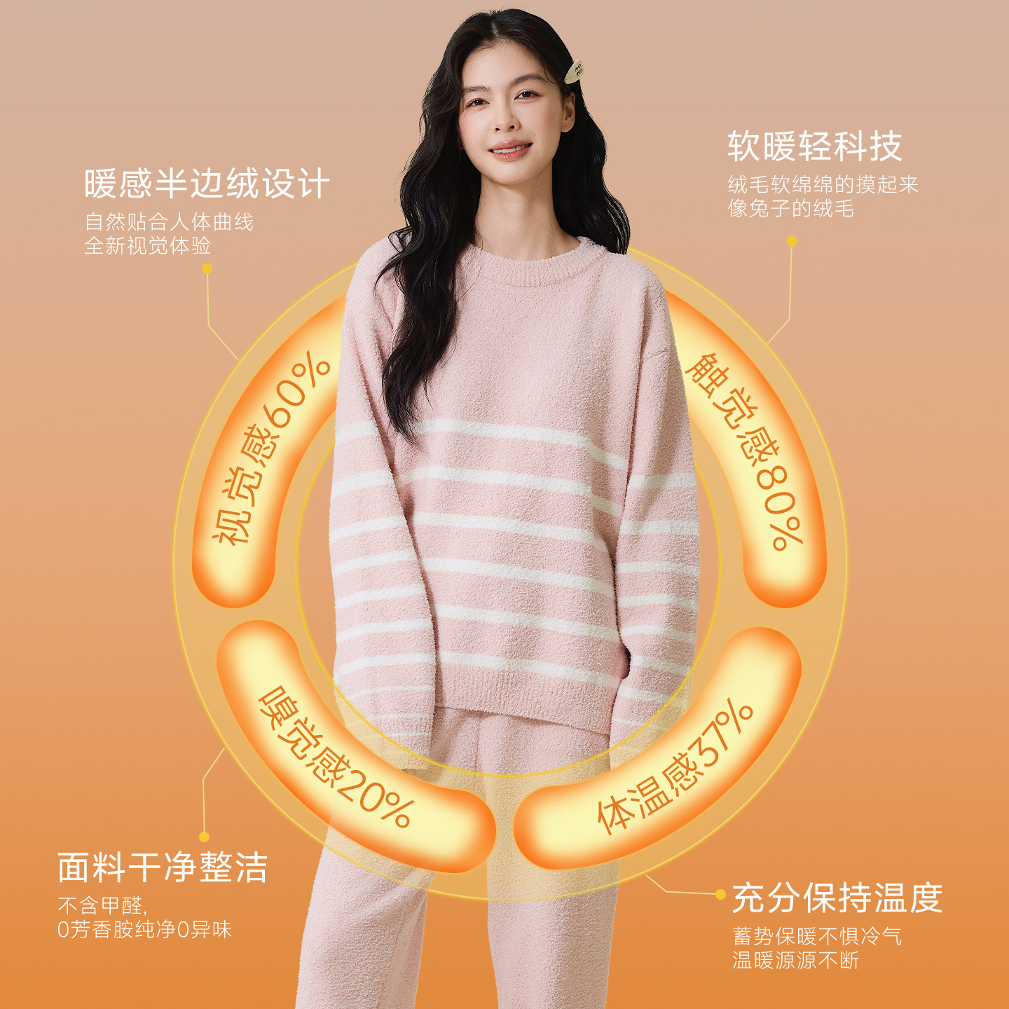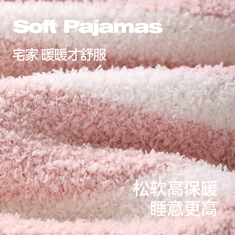 条纹甜美可外穿奶fufu家居服套装 猫人半边绒保暖睡衣女款 秋冬季