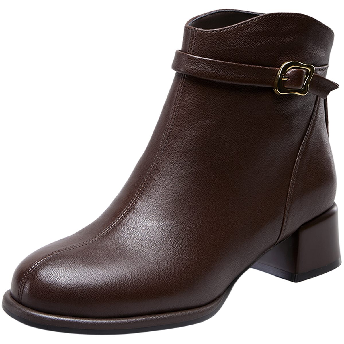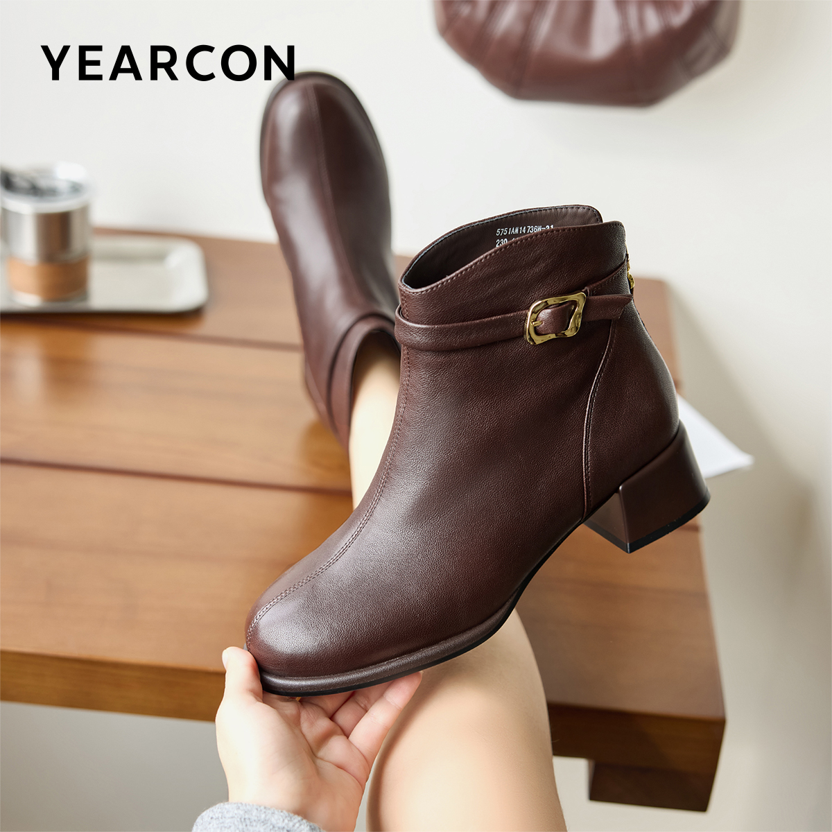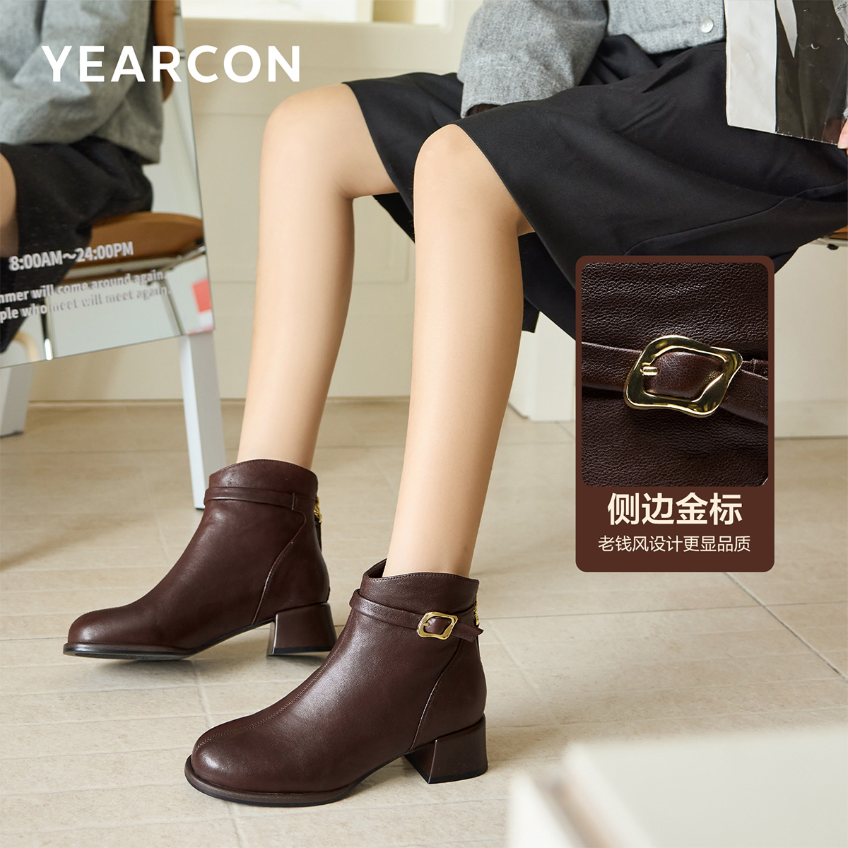 加绒短靴粗跟气质羊皮及踝靴女士皮鞋 真皮法式 2025冬季 意尔康女鞋
