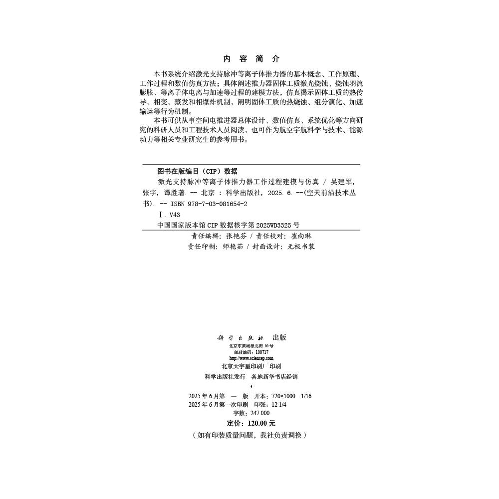 张宇 吴建军 谭胜 科学出版 空天前沿技术丛书 现货速发 社9787030816542 激光支持脉冲等离子体推力器工作过程建模与仿真