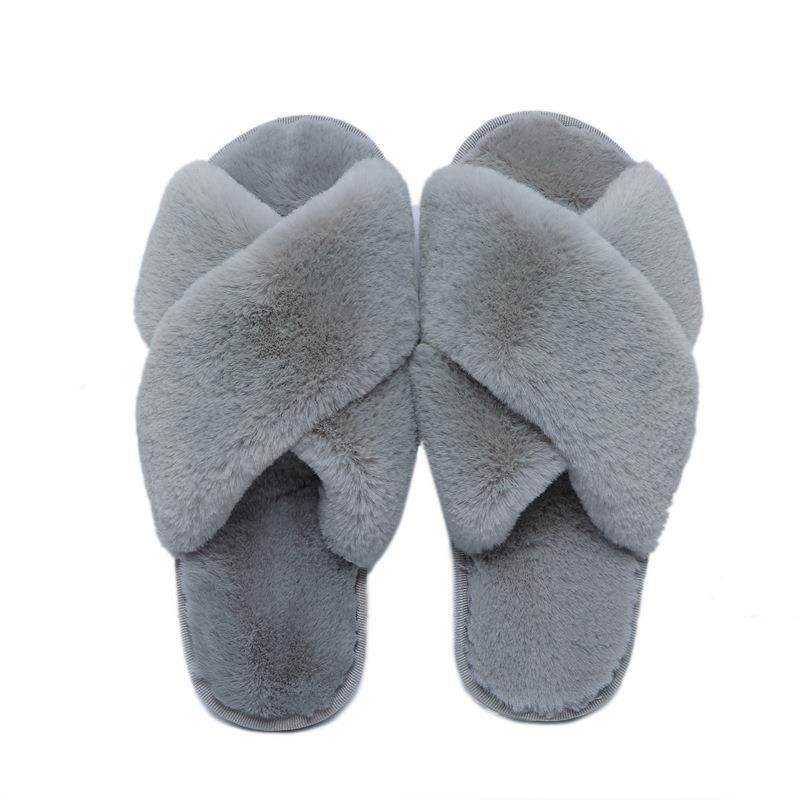 跨境外贸亚马逊交叉毛毛拖鞋 女 女秋冬平底家居家地板拖露趾棉拖鞋