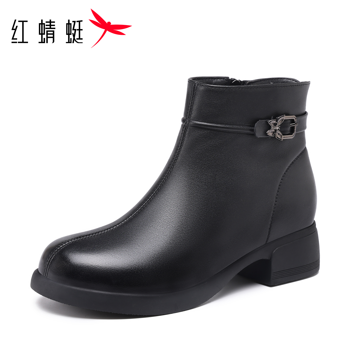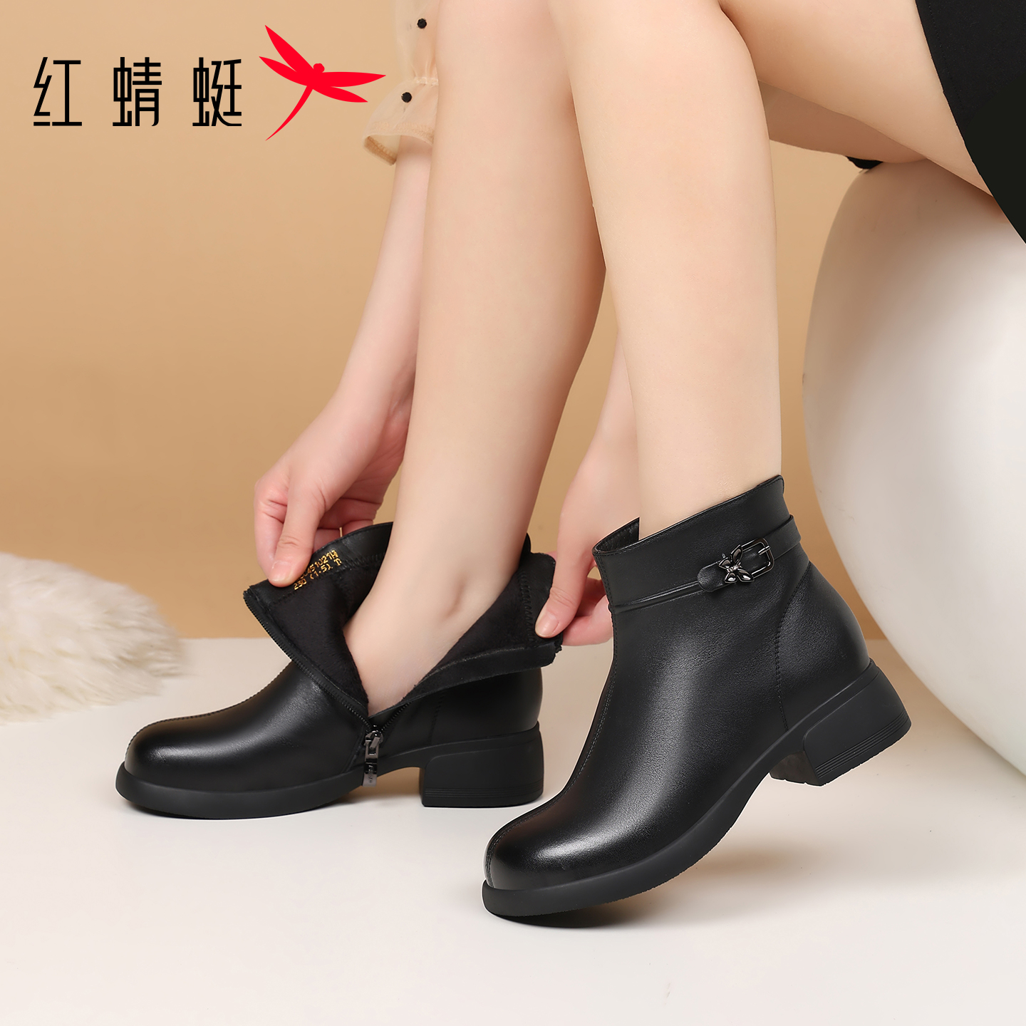 女士靴子女中筒短靴真皮加绒高帮皮靴妈妈棉靴 新款 红蜻蜓冬季 女鞋
