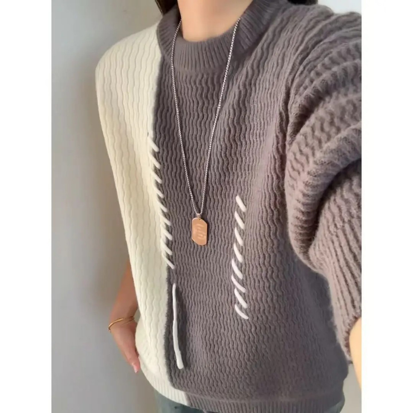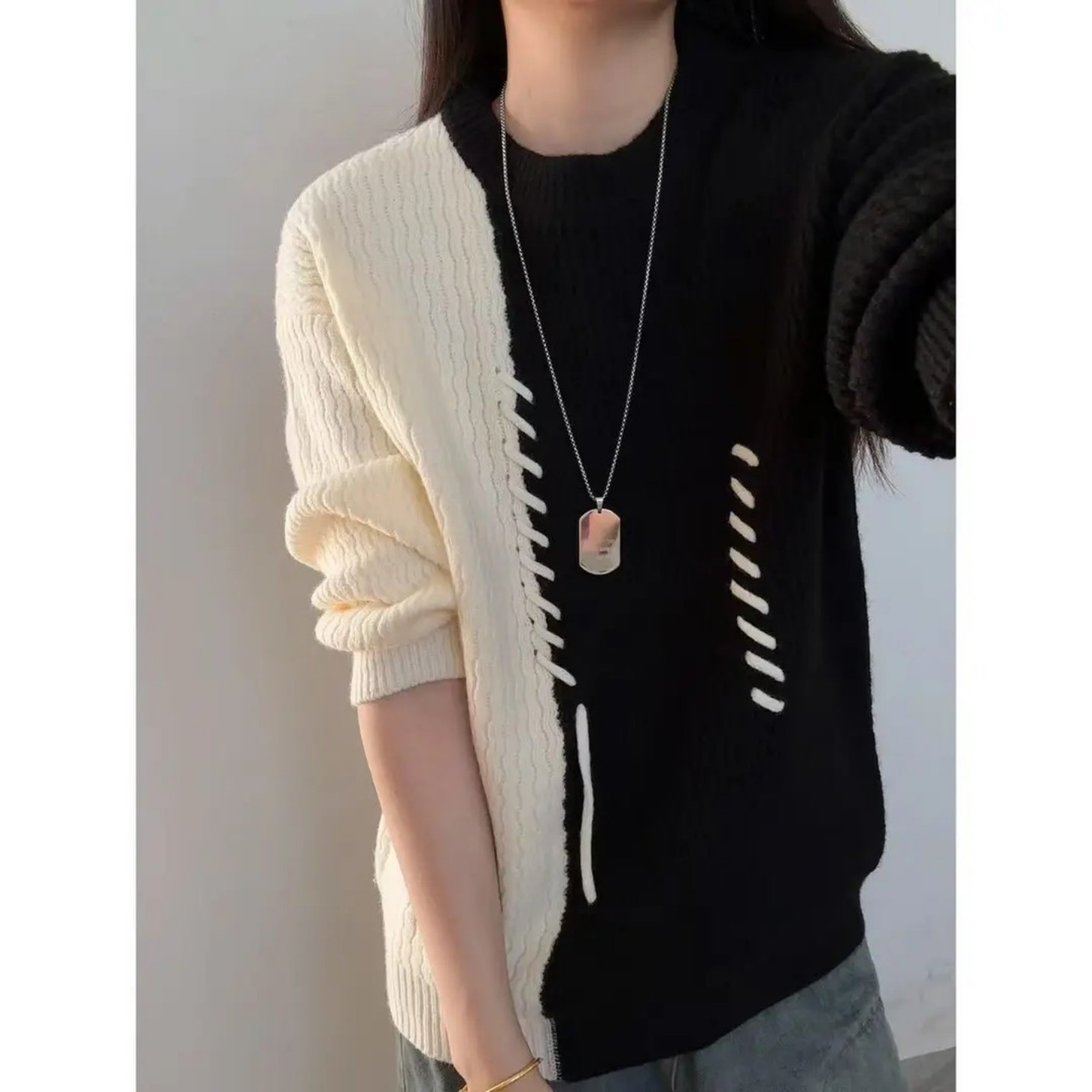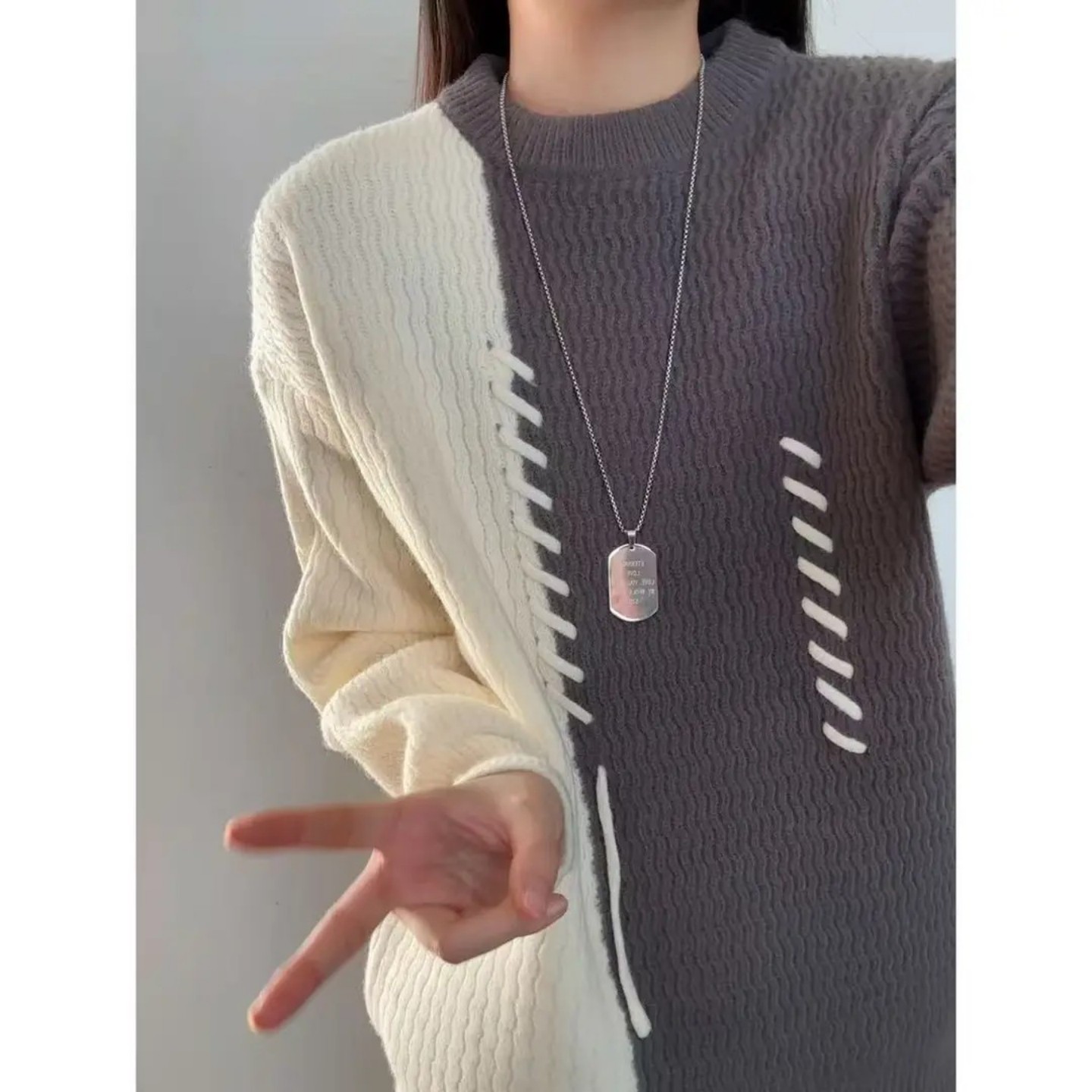 红白拼色绞花缝线毛衣男女秋冬宽松慵懒风针织衫 复古情侣外套 美式