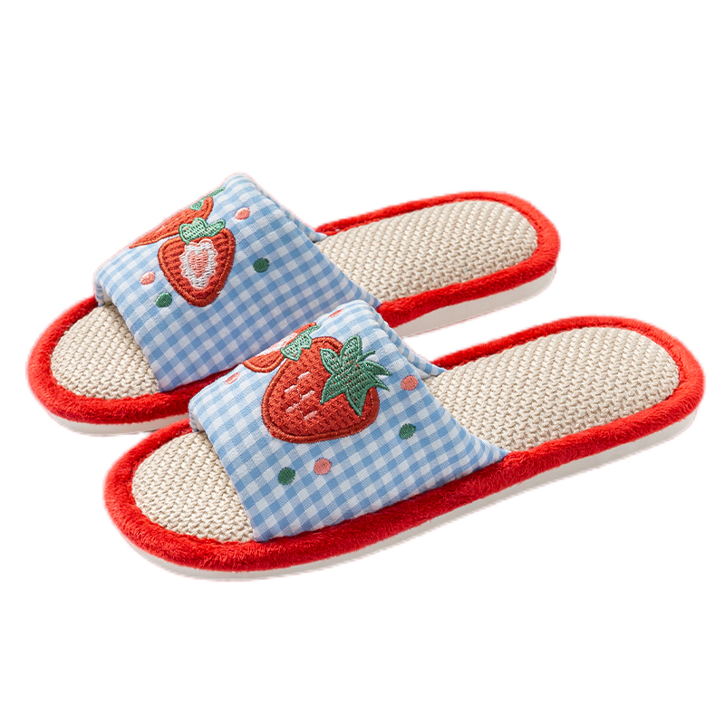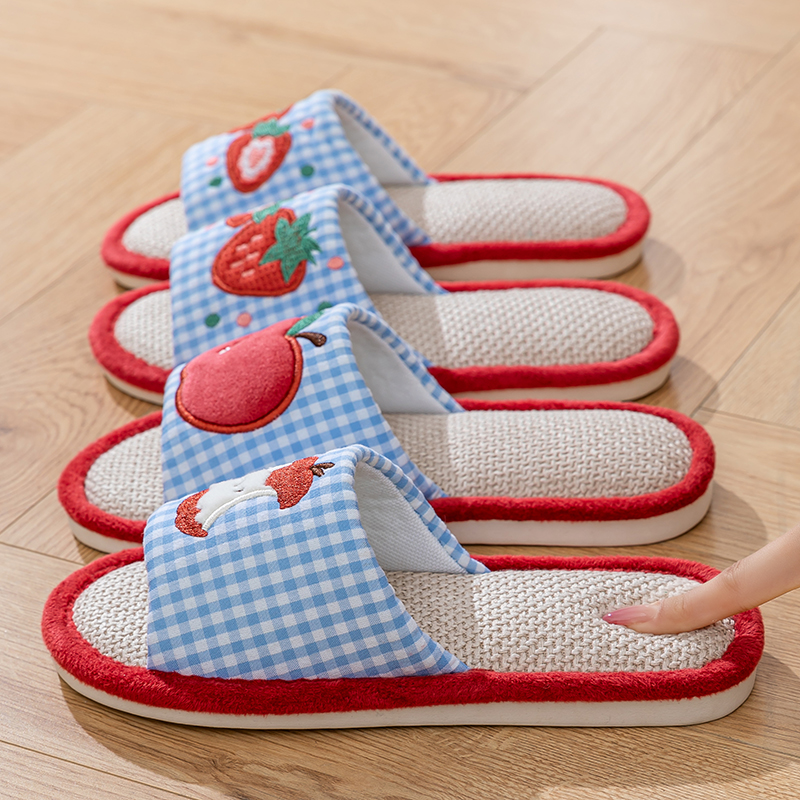草莓亚麻拖鞋 居家室内棉麻透气防滑静音地板家用情侣男 女春秋四季