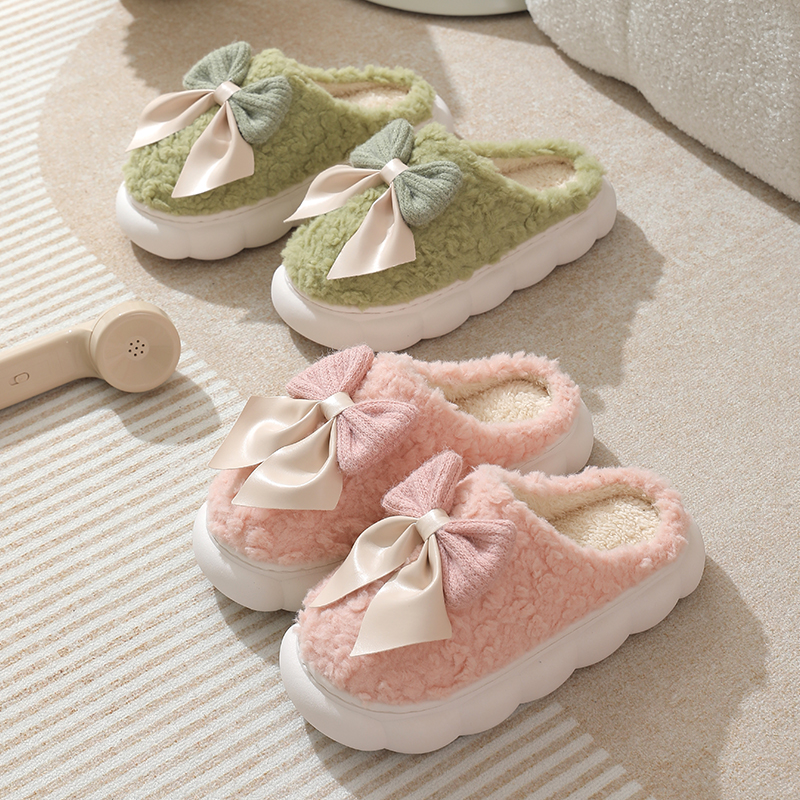 女士家居家用情侣室内外防滑保暖厚底毛毛拖鞋 蝴蝶结秋冬季 棉拖鞋