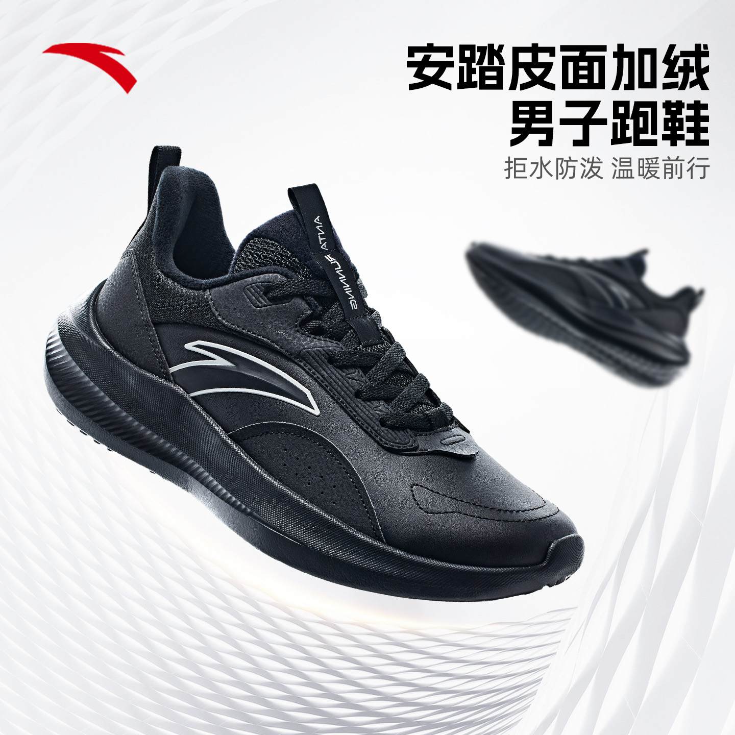 男鞋 二棉鞋 新款 加绒跑步皮面黑武士全黑色男士 子男 冬季 安踏运动鞋