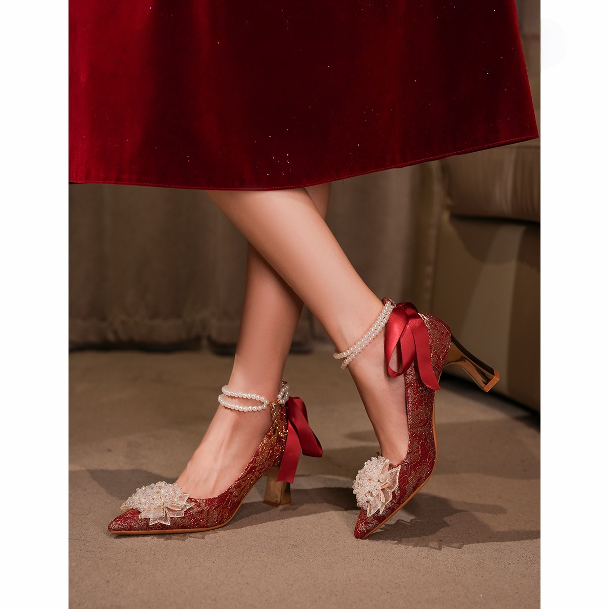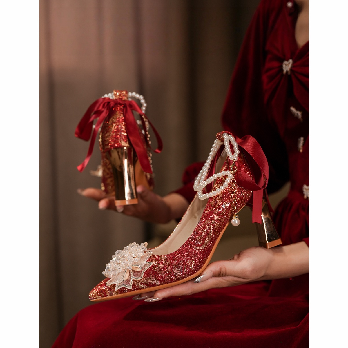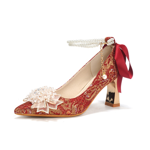粗跟不累脚高跟鞋 中式 女珍珠链子秀禾服婚鞋 水钻蝴蝶结红色新娘鞋