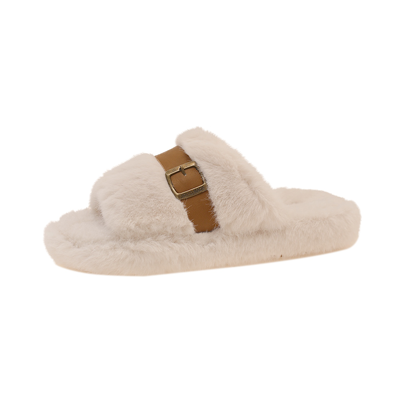 皮带扣室内家居防滑毛绒保暖一字棉拖鞋 外穿时尚 女士冬季 毛毛拖鞋