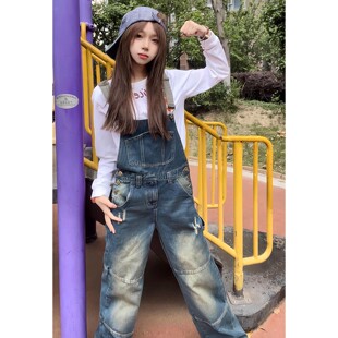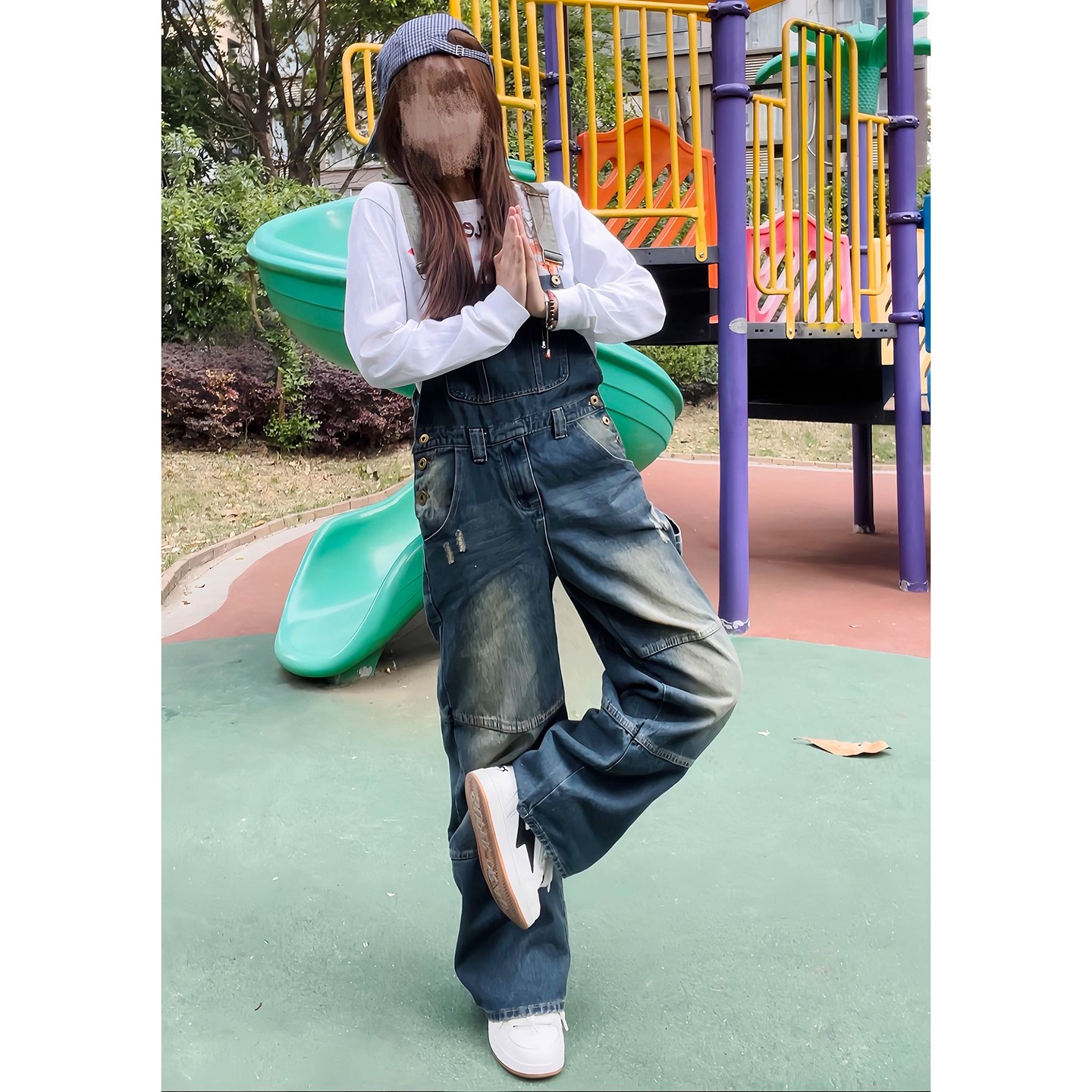拖地长裤 春秋减龄毛边宽松直筒工装 女2025新款 复古阔腿牛仔背带裤