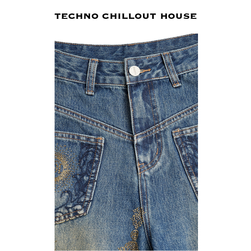 T75C20E1143 新款 TCH私服烫钻潮牌高腰显瘦弯刀阔腿牛仔裤 女25秋季