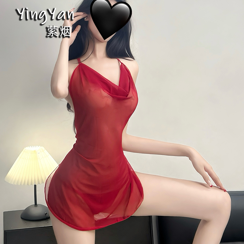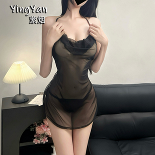 萦烟性感荡领网纱透视吊带睡裙制服纯欲风收腰修身 显瘦家居睡衣