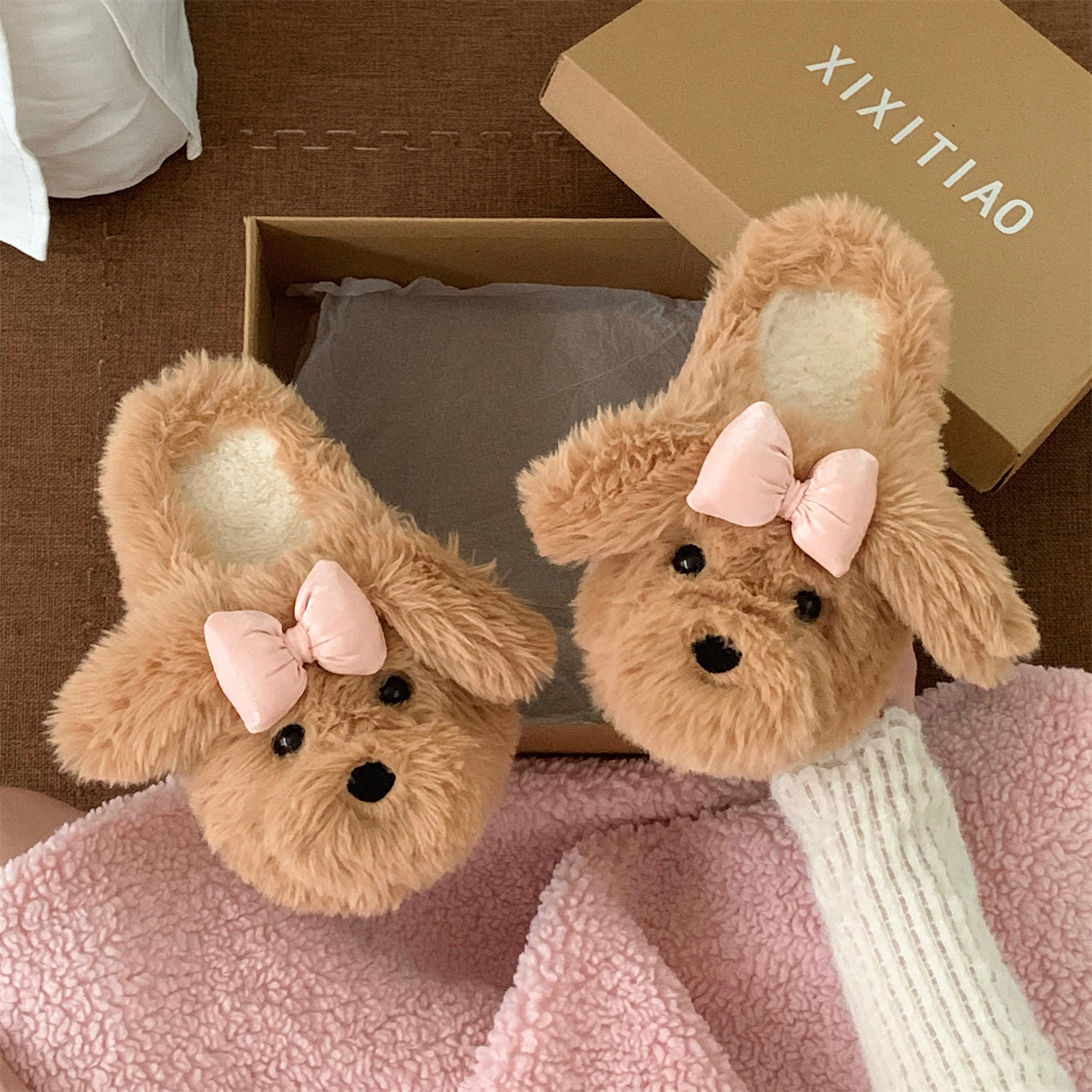 甜美可爱蝴蝶结小狗室内月子鞋 百搭ins潮防滑棉拖鞋 女 冬季 细细条