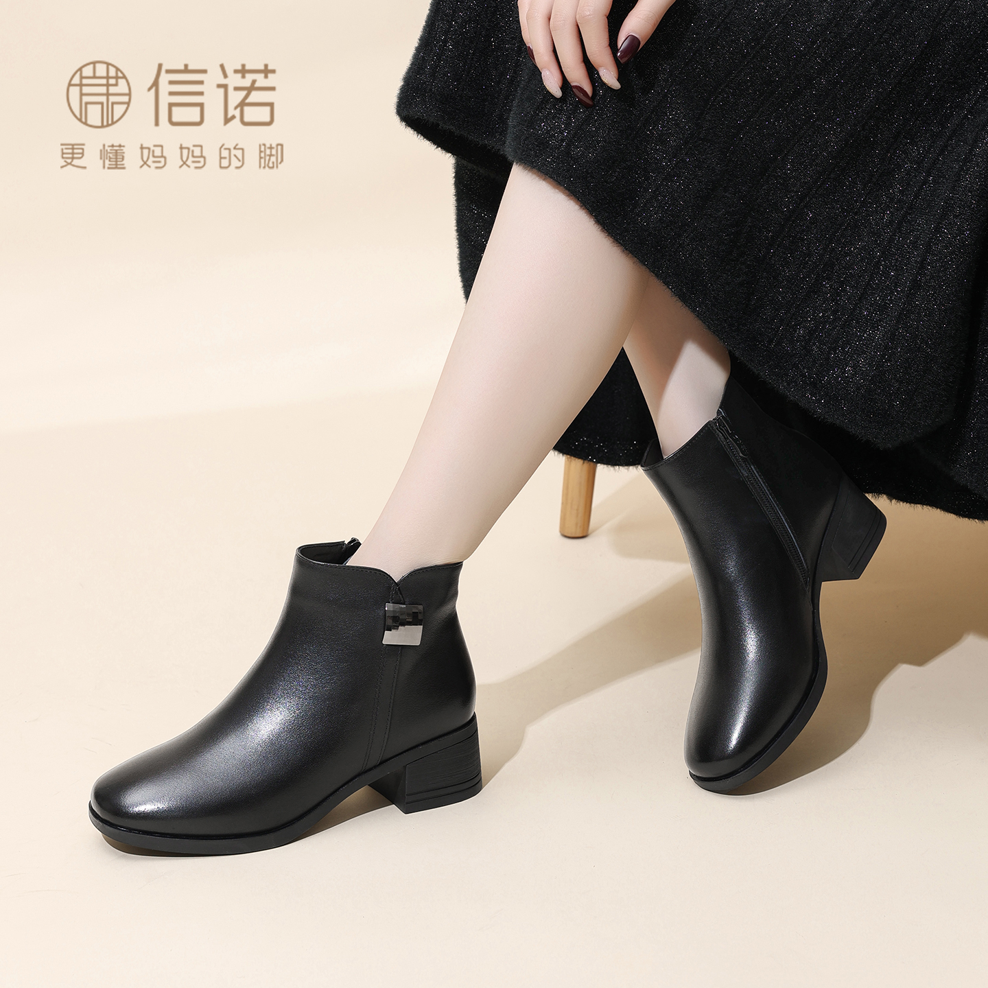 新款 信诺妈妈鞋 2025冬季 真皮女鞋 中老年气质粗跟短靴加绒保暖棉鞋