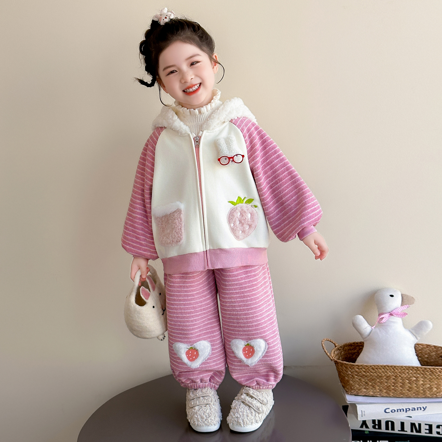 女童套装 洋气女宝宝可爱条纹草莓连帽外套加绒加厚两件套 秋冬新款