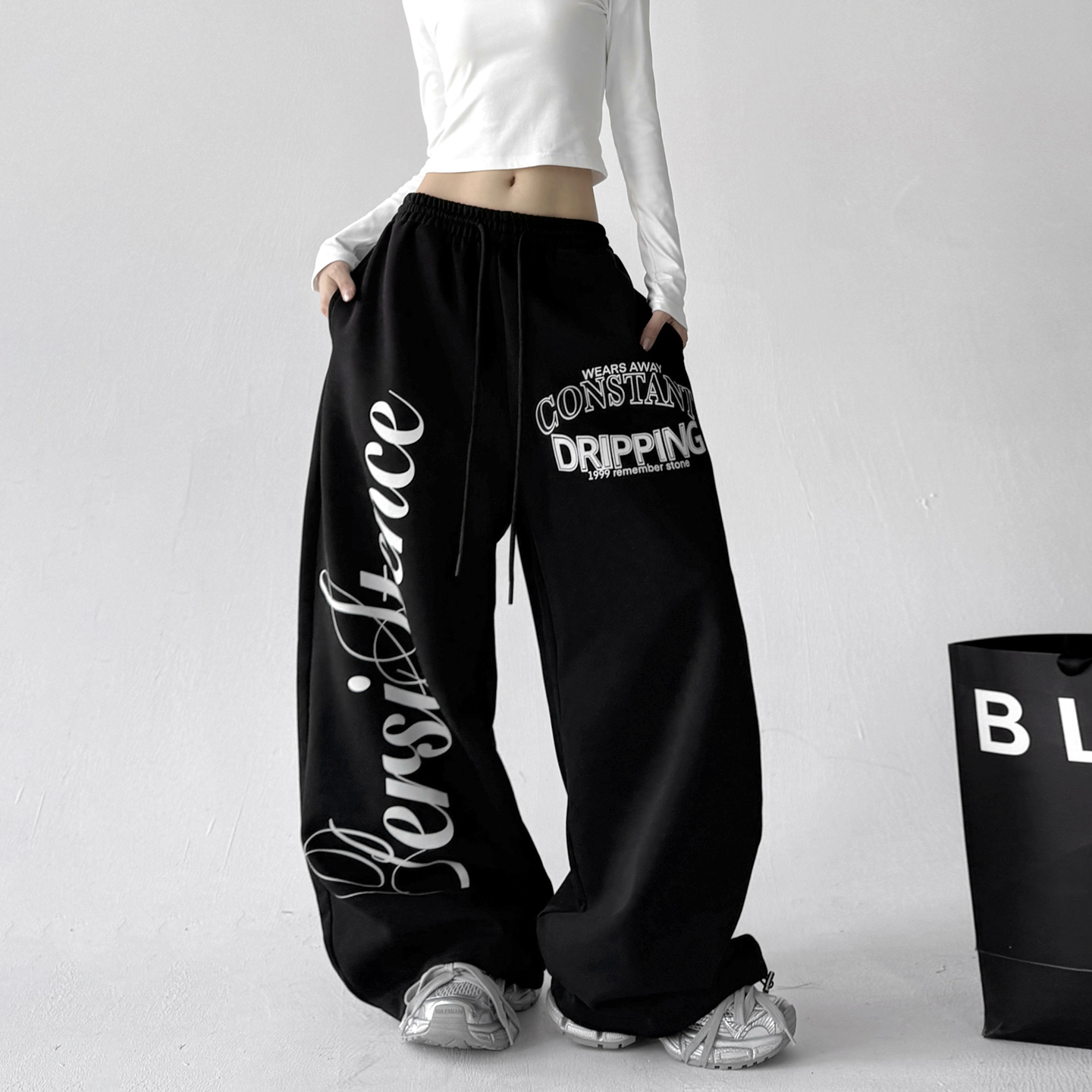 宽松阔腿百搭休闲裤 潮流垂感运动长裤 男秋季 V37重磅黑色直筒卫裤