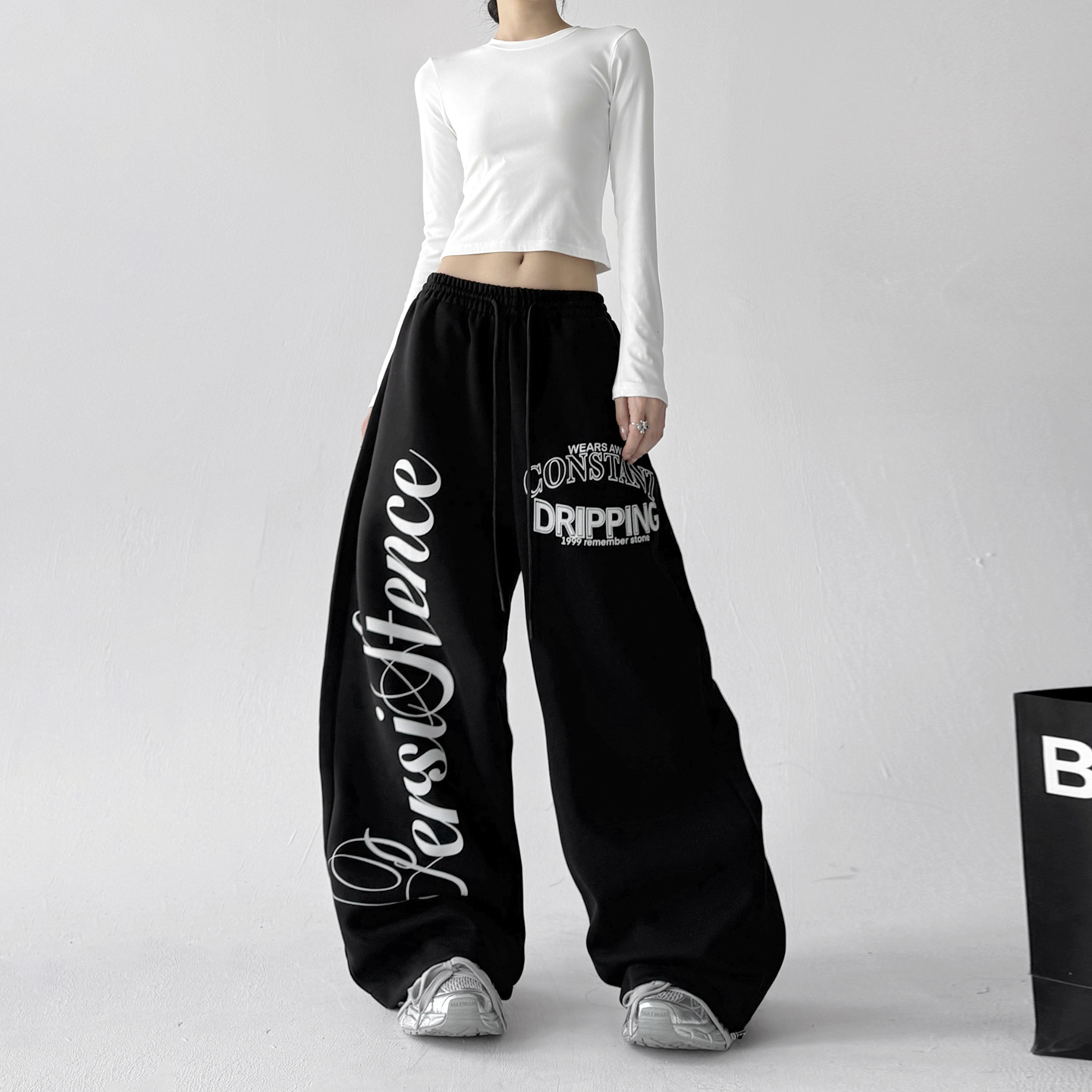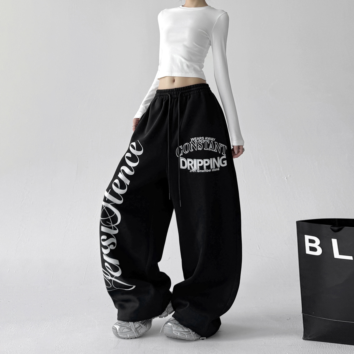 加绒街舞穿搭褶皱宽松休闲长裤 女秋冬季 子 灰色运动卫裤 自然涩美式