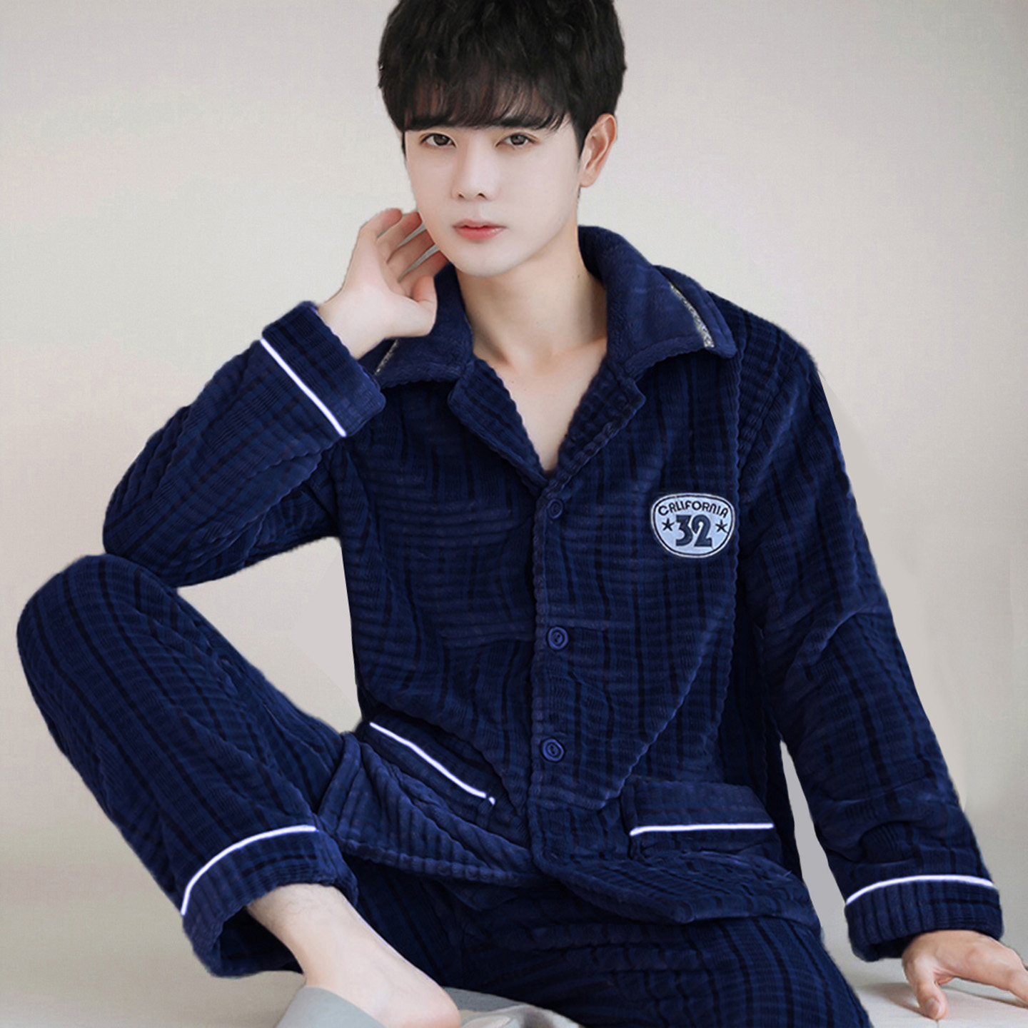 套装 加厚保暖珊瑚绒睡衣男士 开衫 可外穿家居服加大码 法兰绒秋冬季